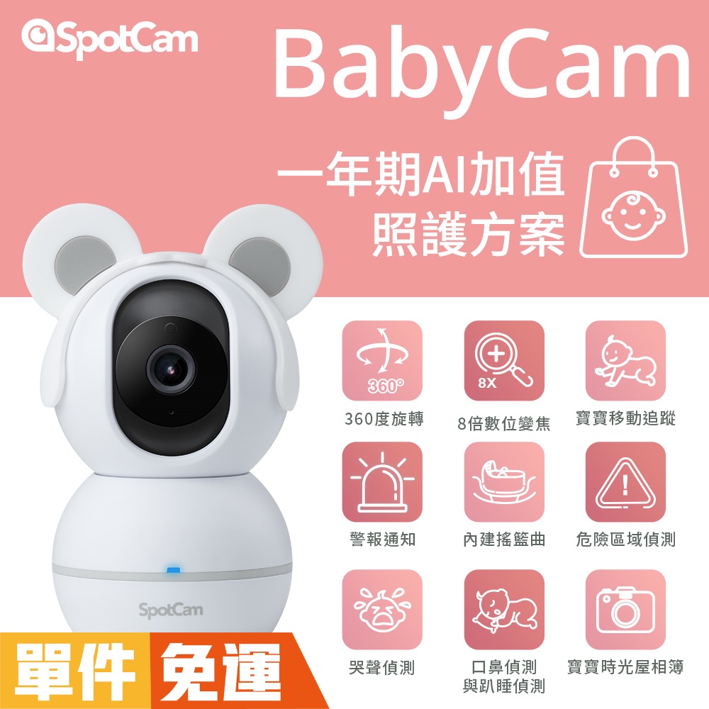 SpotCam BabyCam +一年期照護組 寶寶攝影機 口鼻偵測 哭聲偵測 搖籃曲 危險區域 寶寶日記 嬰兒監視器