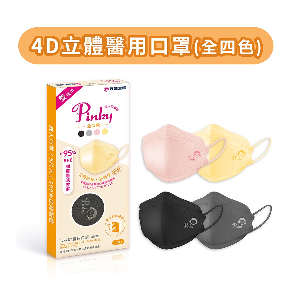 【五洲生醫】Pinky 4D立體醫用口罩 (全4色、5入/盒) 100%台灣製 醫療口罩 魚型口罩神秘黑|個性灰|蜜桃粉|馬卡黃|4種顏色各1盒Medical Gloves & MasksPinky官方旗艦館/五洲生醫