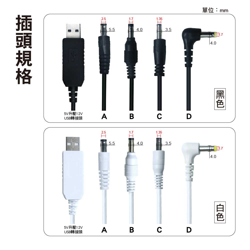 5V升12V DC轉USB 升壓線/電源線/充電線|外徑5.5/4.0/3.5mm|適用路由器/音響/吸塵器等設備黑色,B款直頭 – 4.0×1.7mm孔徑|黑色,C款直頭 – 3.5×1.35mm孔徑|黑色,D款彎頭 – 4.0×1.7mm孔徑|白色,A款直頭 – 5.5×2.5mm孔徑|白色,B款直頭 – 4.0×1.7mm孔徑|白色,C款直頭 – 3.5×1.35mm孔徑|白色,D款彎頭 – 4.0×1.7mm孔徑|黑色,A款直頭 – 5.5×2.5mm孔徑SUNYES 官方旗艦店