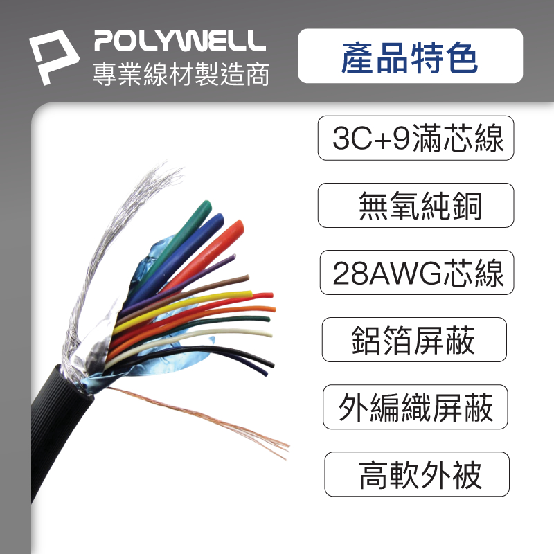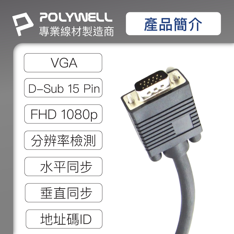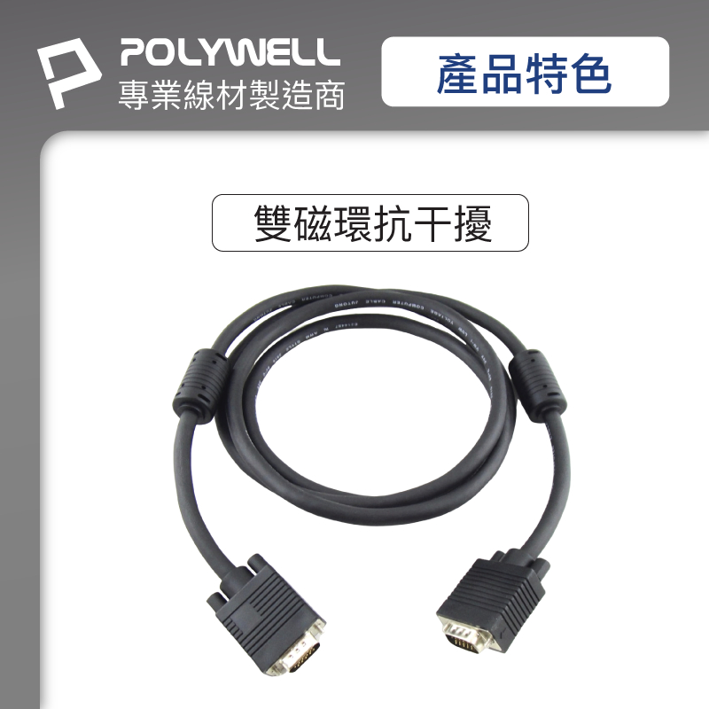 POLYWELL VGA線 1米~15米 3+9 1080P 雙磁環 VGA 工程線 電腦螢幕線 寶利威爾 台灣現貨13米|15米|2米|3米|5米|8米|10米|1米POLYWELL寶利威爾官方旗艦店