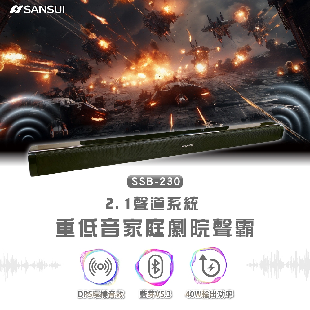 【SANSUI 山水】2.1聲道藍芽家庭劇院聲霸 3D立體聲重低音 升級版 SSB-230藍芽家庭劇院聲霸SSB-230 升級版Home Theater SystemsSANSUI山水 官方旗艦店 | 創造美好舒適生活