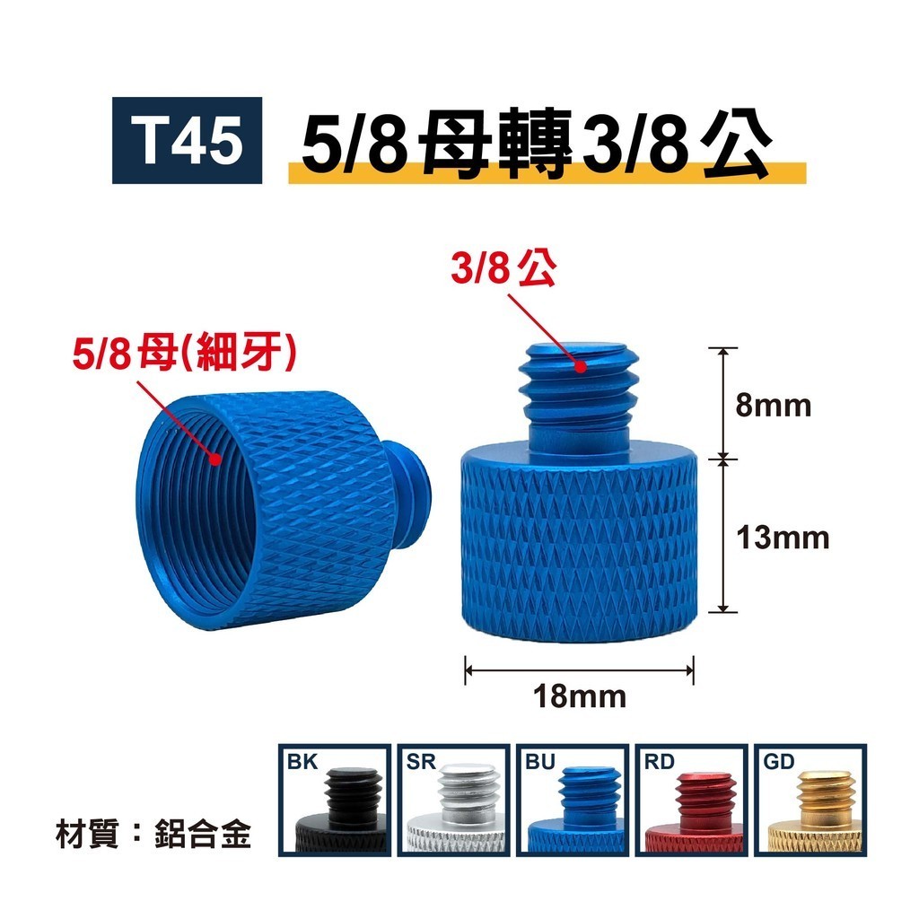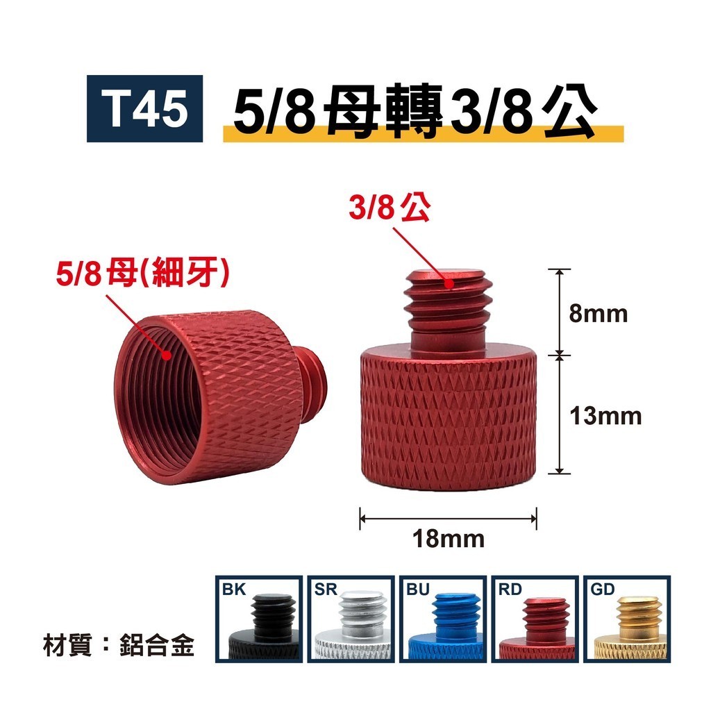 5/8母轉3/8公轉接螺絲|細牙|貨號T45|鋁合金|適用麥克風支架/麥克風夾/防震架【T45-BK】5/8母轉3/8公(黑)|【T45-SR】5/8母轉3/8公(銀)|【T45-BU】5/8母轉3/8公(藍)|【T45-RD】5/8母轉3/8公(紅)|【T45-GD】5/8母轉3/8公(金)SUNYES 官方旗艦店