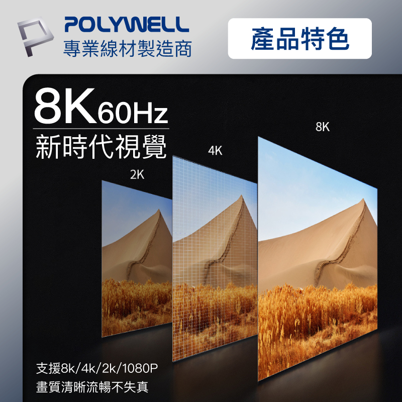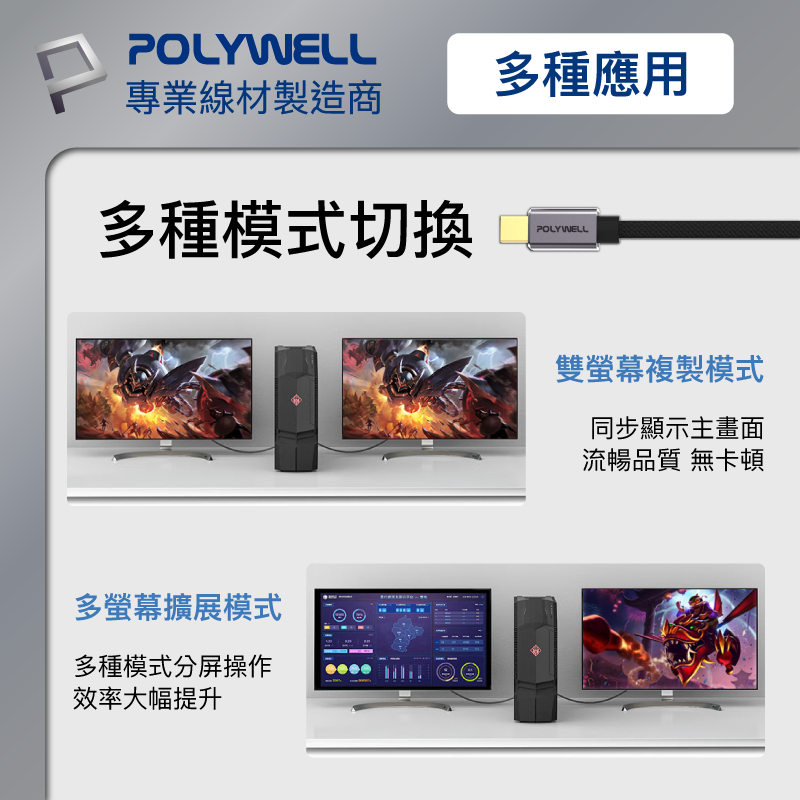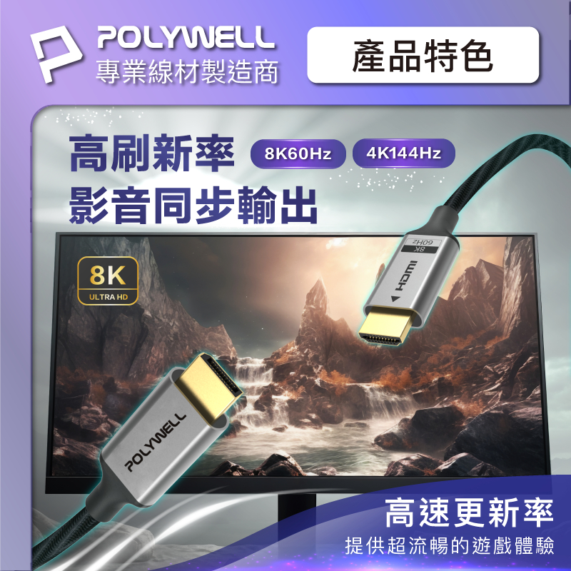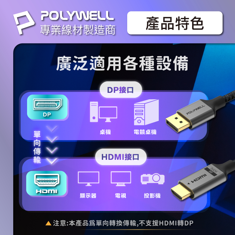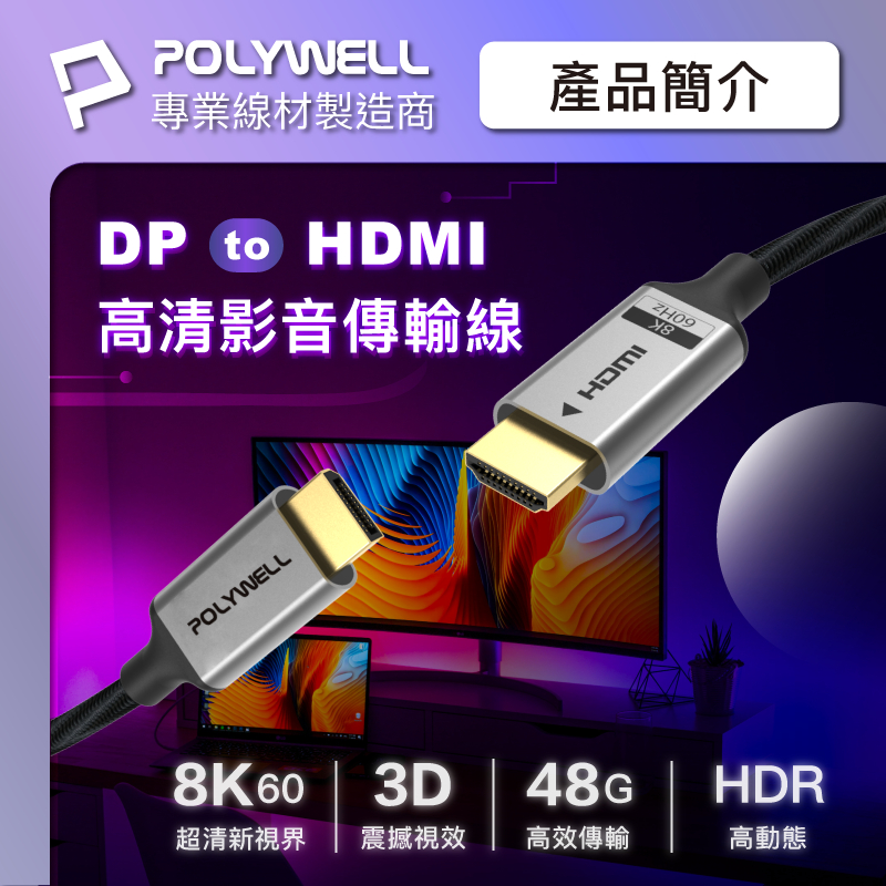 POLYWELL DP轉HDMI 8K60Hz 影音傳輸線 1~3米 轉接線 主動晶片 鋁合金帶編織 寶利威爾 台灣現貨1米|2米|3米POLYWELL寶利威爾官方旗艦店