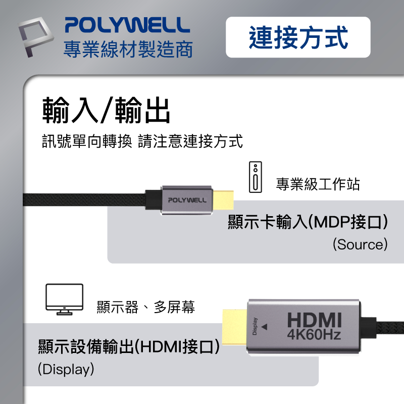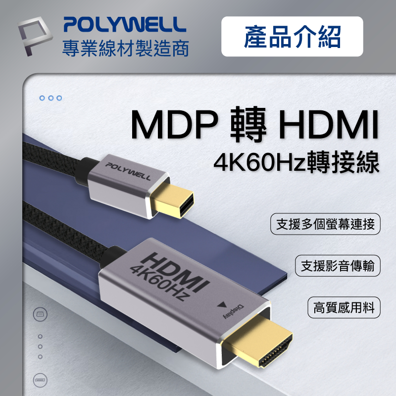 POLYWELL MDP轉HDMI 4K 影音傳輸線 2米 轉接線 多螢幕 工作站顯卡 影音轉接 寶利威爾 台灣現貨MDP轉HDMI 4K 影音傳輸線POLYWELL寶利威爾官方旗艦店