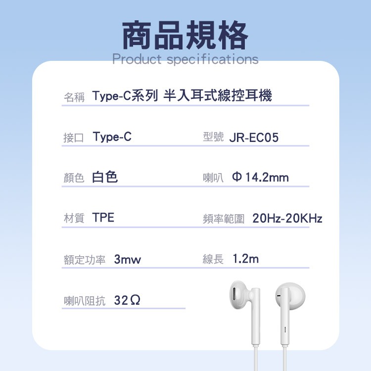 JOYROOM JR-EC05 Type-C系列 半入耳式線控耳機 適用 iphone15/16 可通話白色SHOWHAN手機周邊生活用品旗艦店