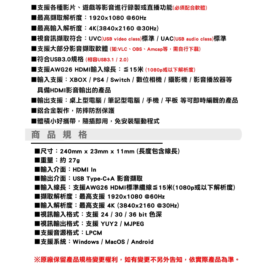 伽利略 USB3.2 Gen1 TypeC+A HDMI影音擷取器 1080P@60 U3THVAC伽利略 USB3.2 Gen1 TypeC+A HDMI影音擷取器 1080P@60 U3THVACSound Amazing