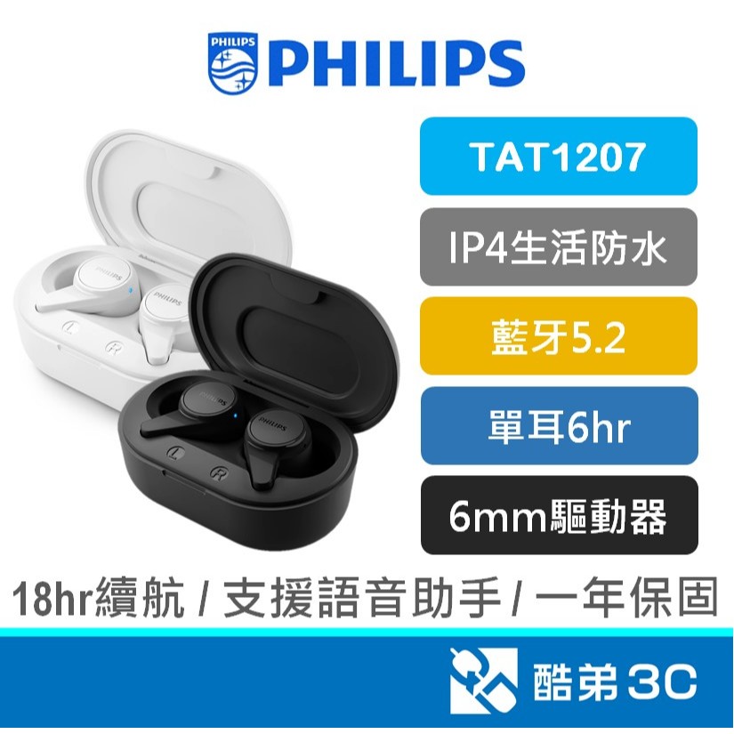 PHILIPS 飛利浦 TAT1207 真無線藍芽耳機 IPX4防水 藍芽耳機 耳機 藍牙耳機 入耳式 無線耳機 公司貨白|黑QD 酷弟3C