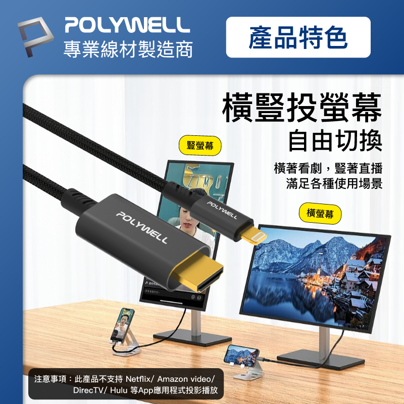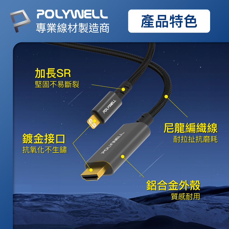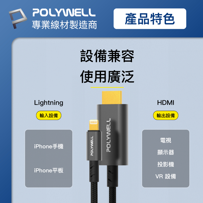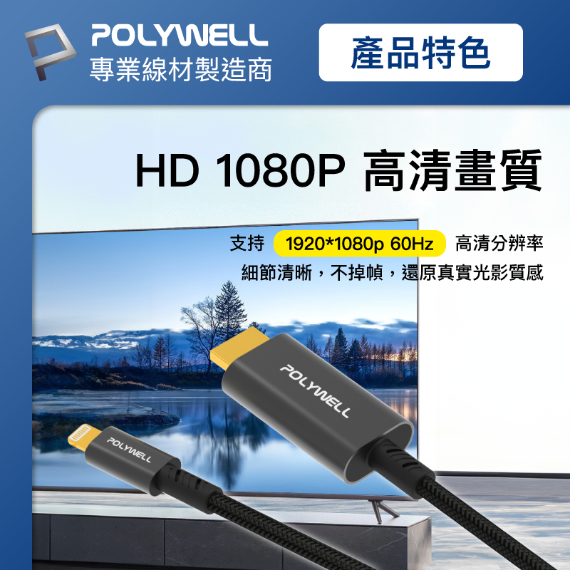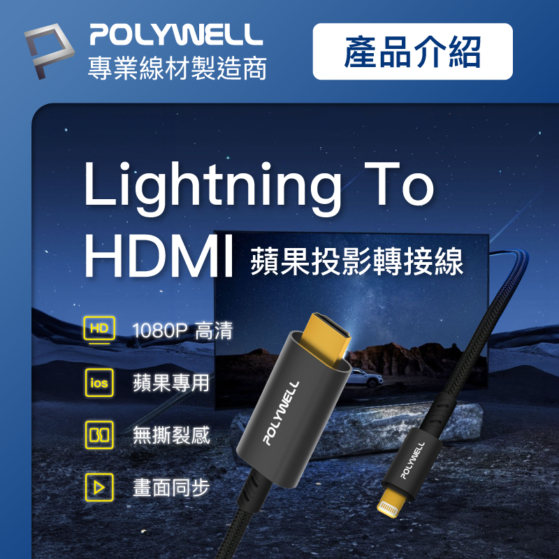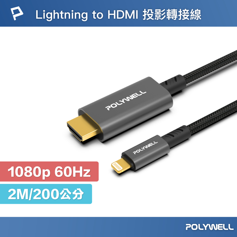 POLYWELL Lightning轉HDMI 1080p 2米 影音轉接線 iPhone14 寶利威爾 台灣現貨Lightning轉HDMIPOLYWELL寶利威爾官方旗艦店