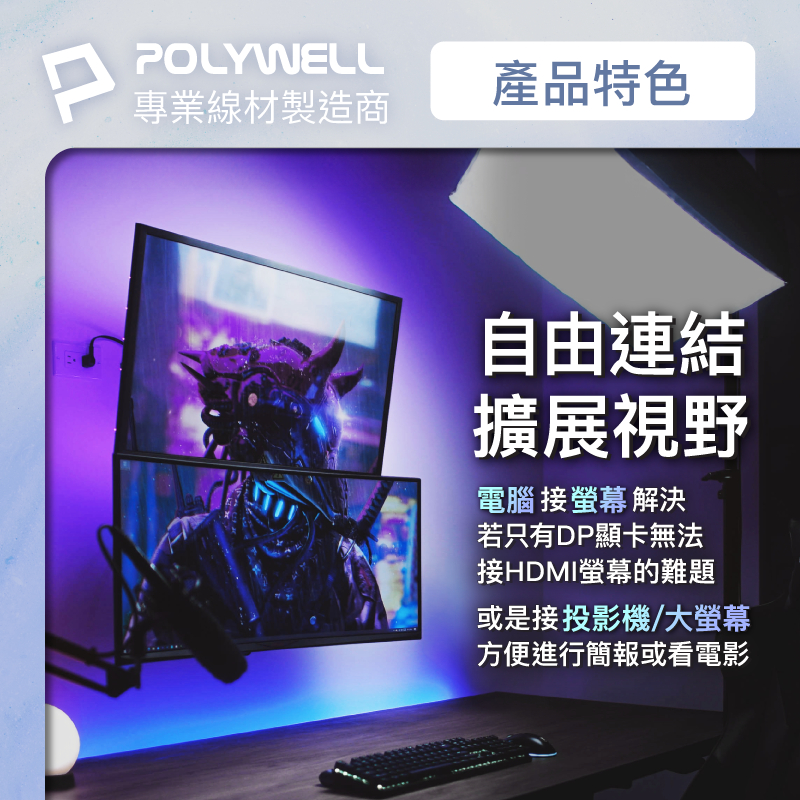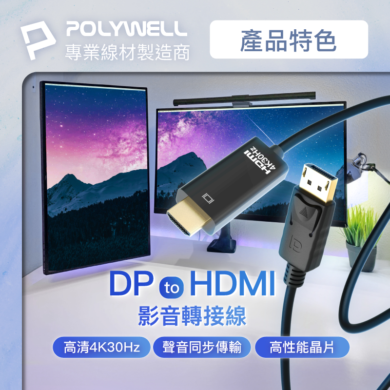 POLYWELL DP轉HDMI 4K30Hz 影音傳輸線 1~3米 轉接線 高性能晶片 鍍金接頭 寶利威爾 台灣現貨1米/100公分|2米/200公分|3米/300公分POLYWELL寶利威爾官方旗艦店