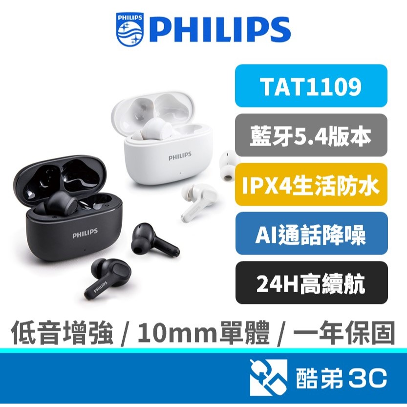 現貨【免運】PHILIPS 飛利浦 藍牙耳機 無線耳機 強力低音 藍芽耳機 AI通話降噪 低音增強 TAT1109白色|黑色QD 酷弟3C