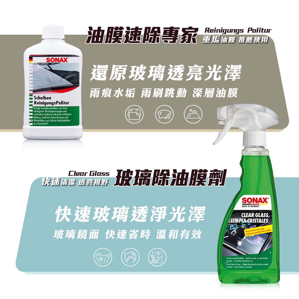 SONAX 玻璃除油膜組(玻璃清潔劑+深層油膜去除膏) 油膜歸零組 重垢油汙清潔 擋風玻璃清潔 德國進口玻璃油膜歸零組合|限時特賣|直播優惠下單區Glass Care & Water RepellentsSONAX 歐洲第一汽車鍍膜 中性洗車藥劑 棕櫚蠟 洗車精 汽車美容 台灣總代理