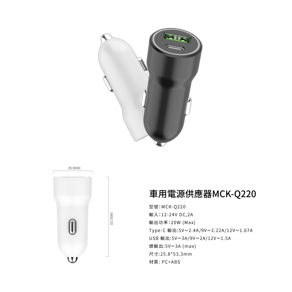 【MCK科技】MCK-Q220 急速快充PD+QC車充(20W)黑色|白色USB Chargers, FM & Bluetooth TransmittersNawies 手機配件 | 代理 倍思 / Lisen / amuok