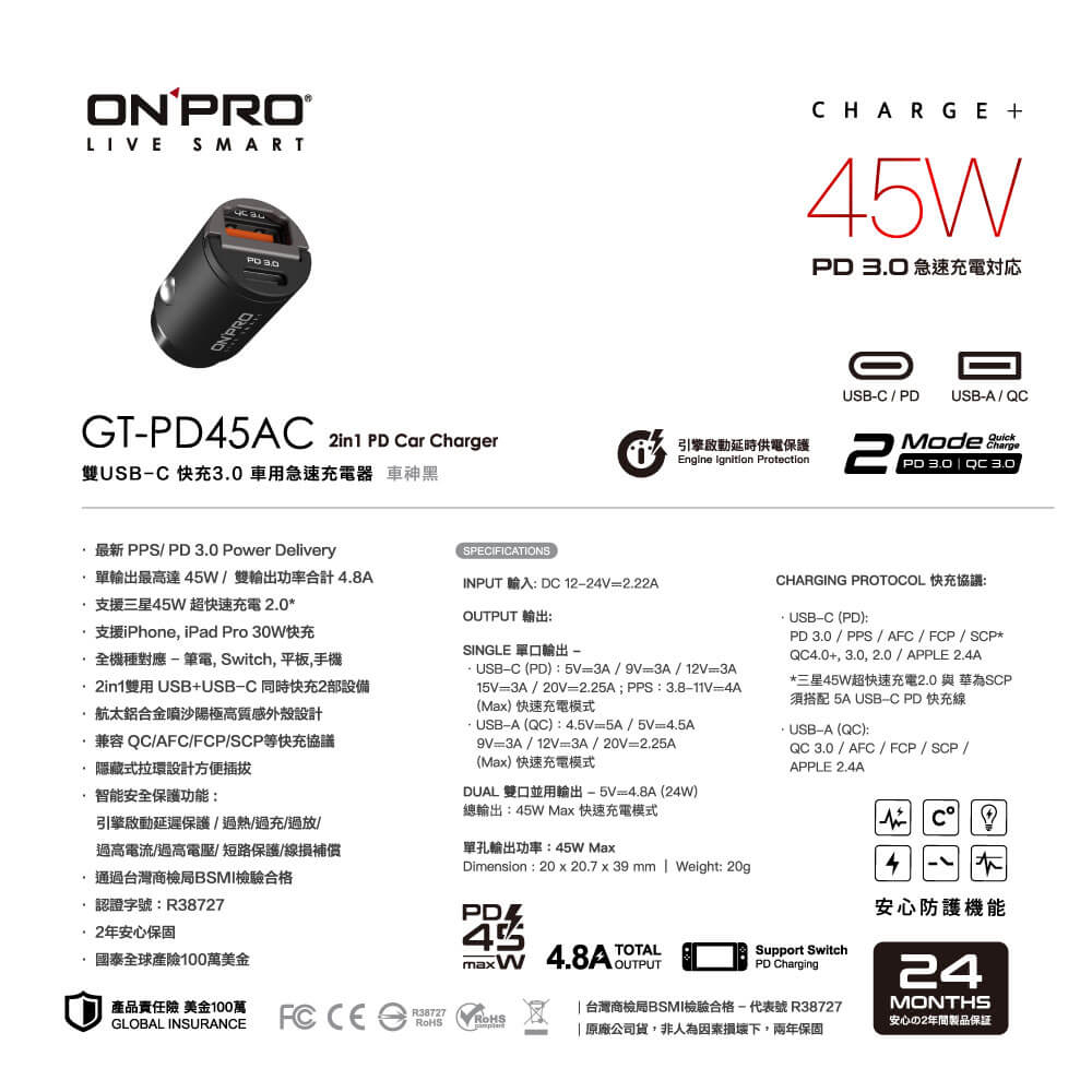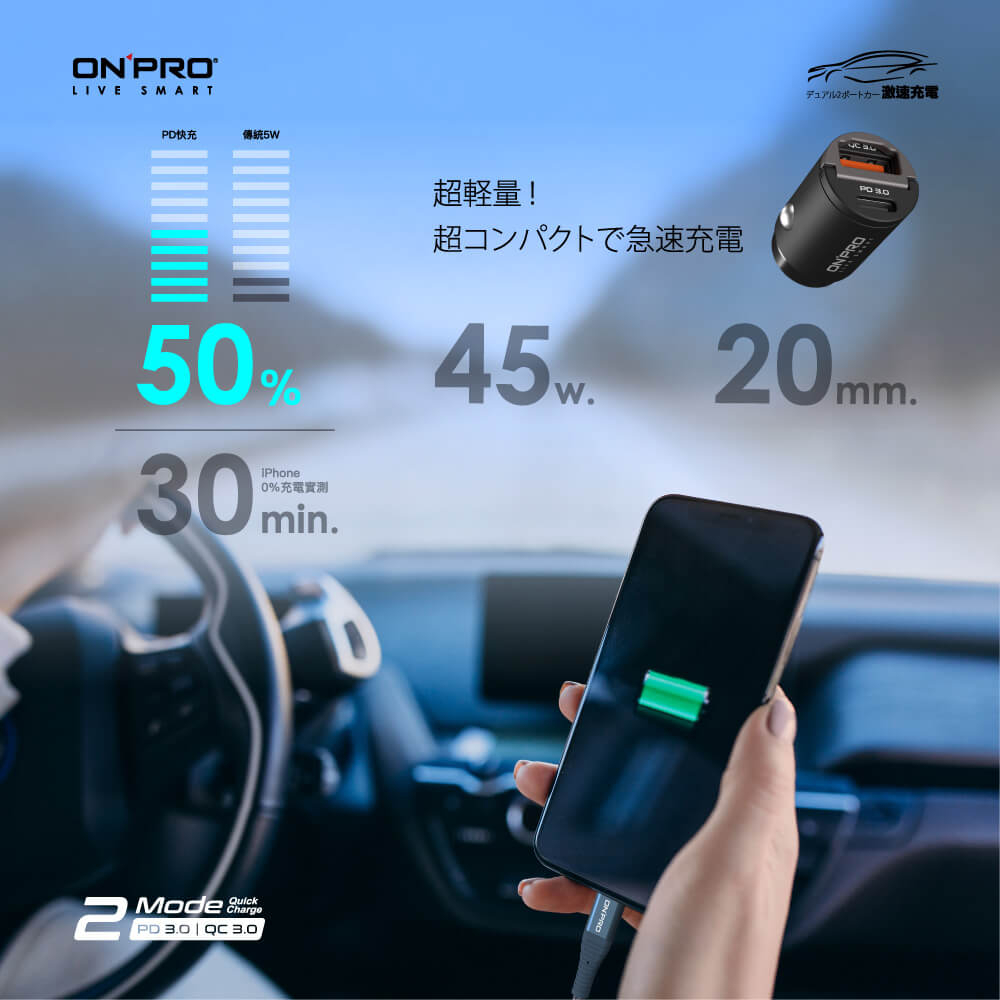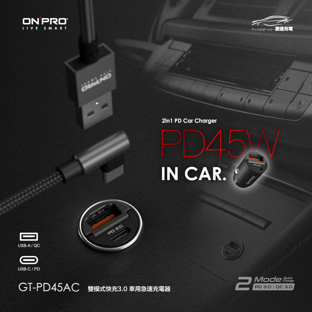 ONPRO GT-PD45AC 45W 隱藏式雙模式車用PD快充充電器車神黑USB Chargers, FM & Bluetooth TransmittersONPRO超急速充電 官方旗艦館