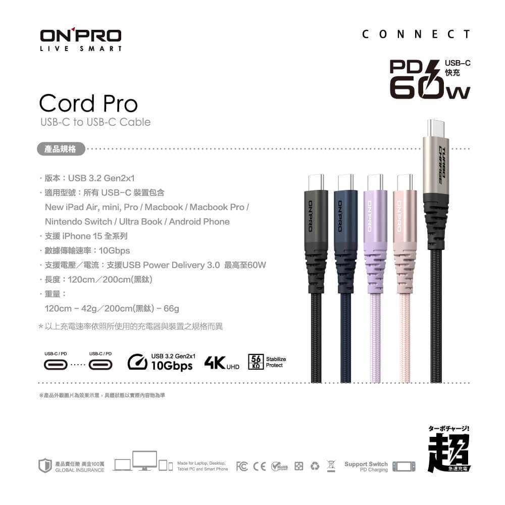 ONPRO GT-P66CC PD USB-C PD快充車充+Cord Pro 1.2M雙Type-C PD快充線66W車充+ 雙USB-C線-黑USB Chargers, FM & Bluetooth TransmittersONPRO超急速充電 官方旗艦館