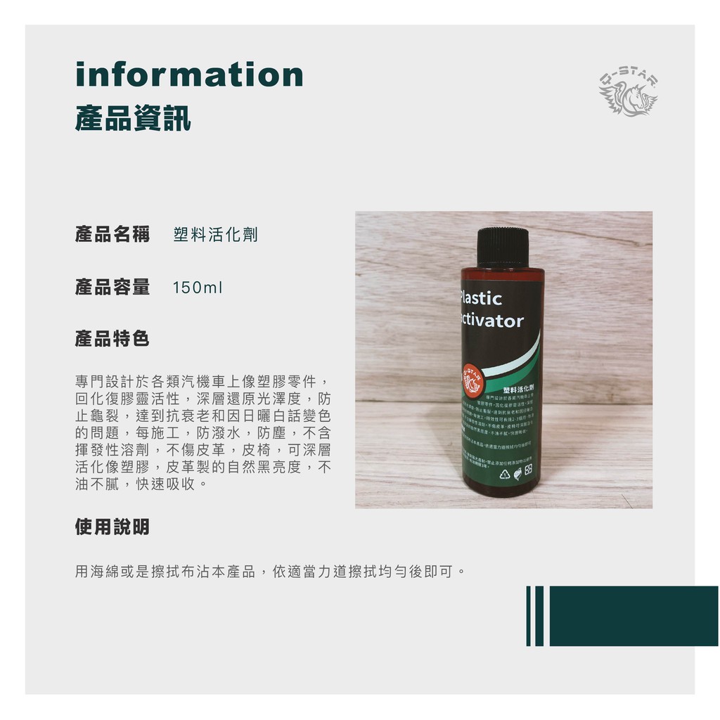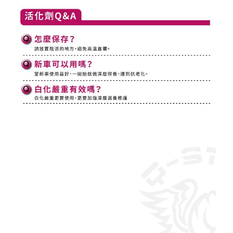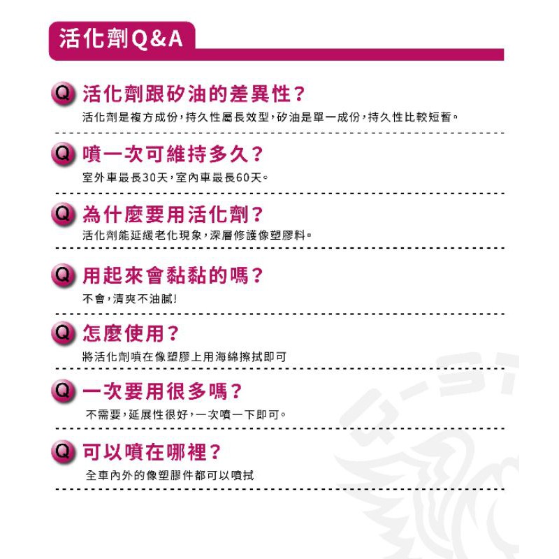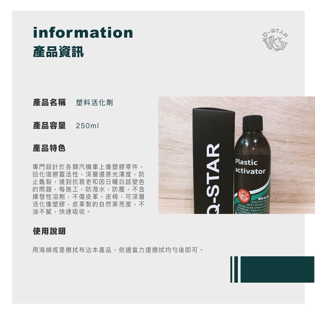 Q-STAR 汽車美容 像塑膠活化劑 長效配方 汽車內裝 橡塑膠保養劑 矽油 塑料還原劑 噴蠟 N99極光像塑膠活化劑150ml|極光像塑膠活化劑250mlInterior CareQ-STAR皇后之鑽有限公司 車蠟 棕梠蠟 汽車美容 洗車用品 鍍膜 洗車打蠟