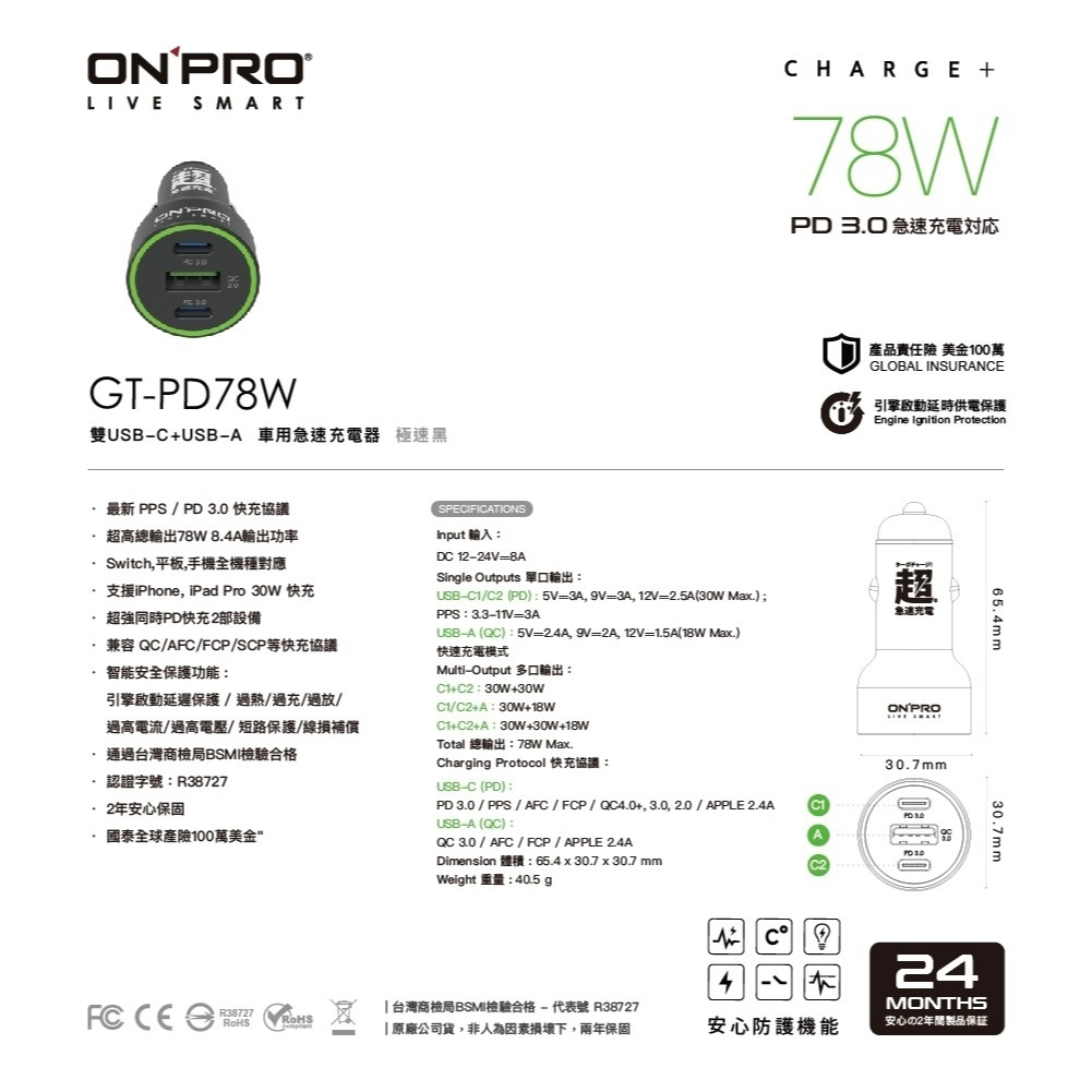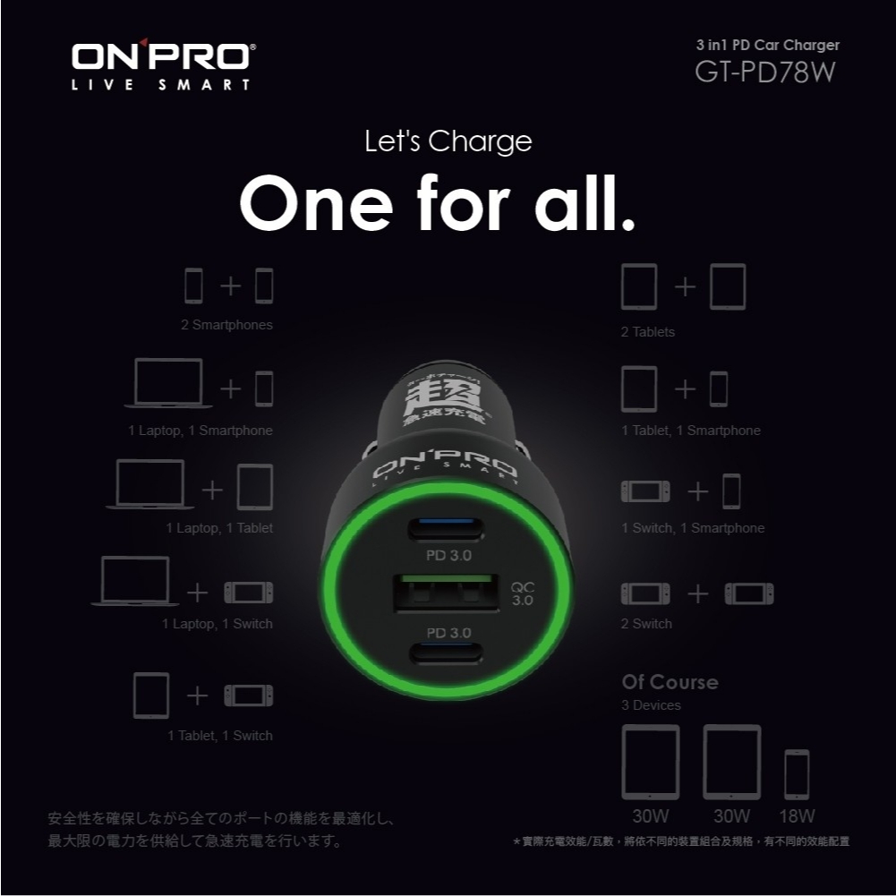 ONPRO GT-PD78W 雙模式快充 急速車充 三孔 PD快充 Type-C USB 車用充電器 點煙器 ON492C1A 78W車充USB Chargers, FM & Bluetooth TransmittersQ哥 旗艦商城|最專業的保護貼手機配件
