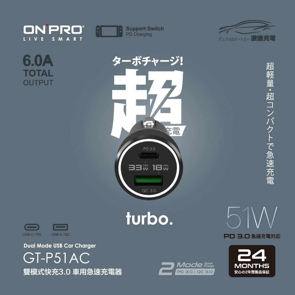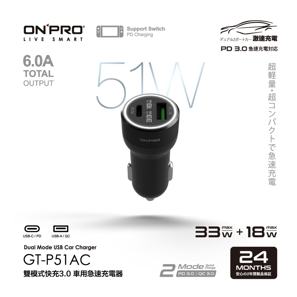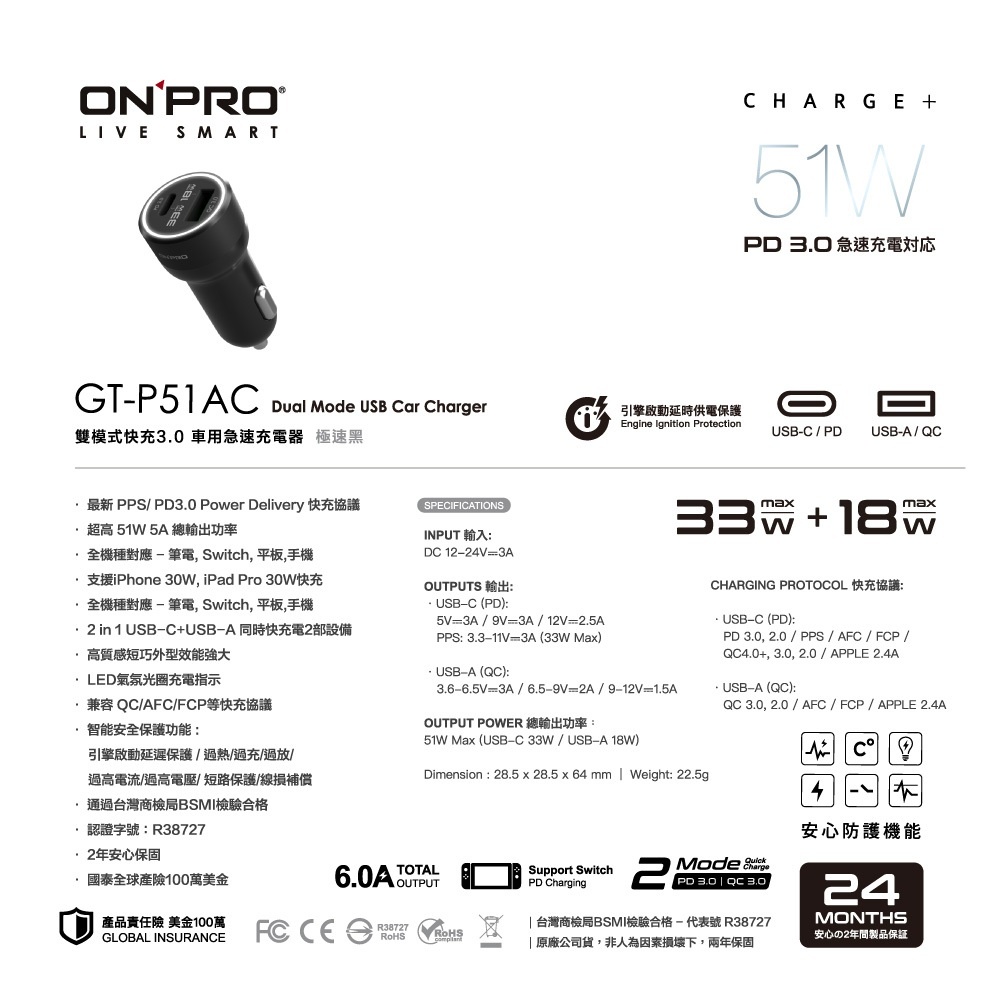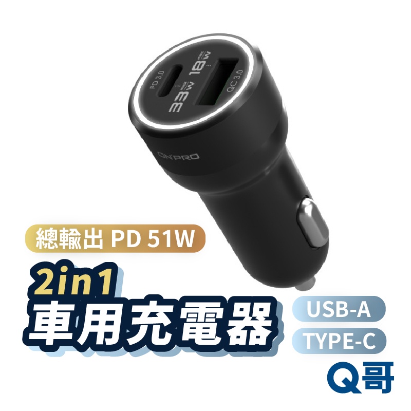 ONPRO GT-P51CA 雙模式車充 車用充電器 typeC USB雙孔快充 車充快充 PD51W 點煙器 ON13車神黑USB Chargers, FM & Bluetooth TransmittersQ哥 旗艦商城|最專業的保護貼手機配件