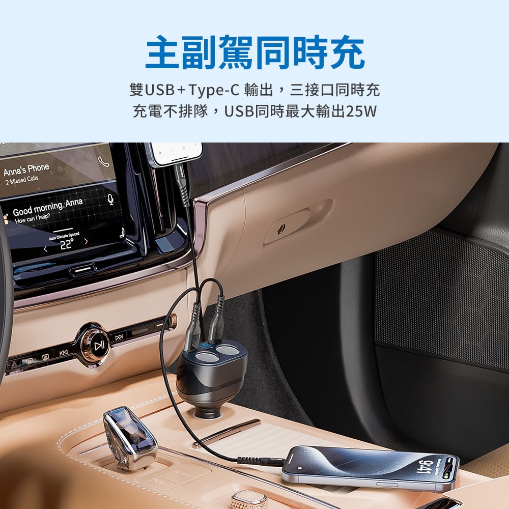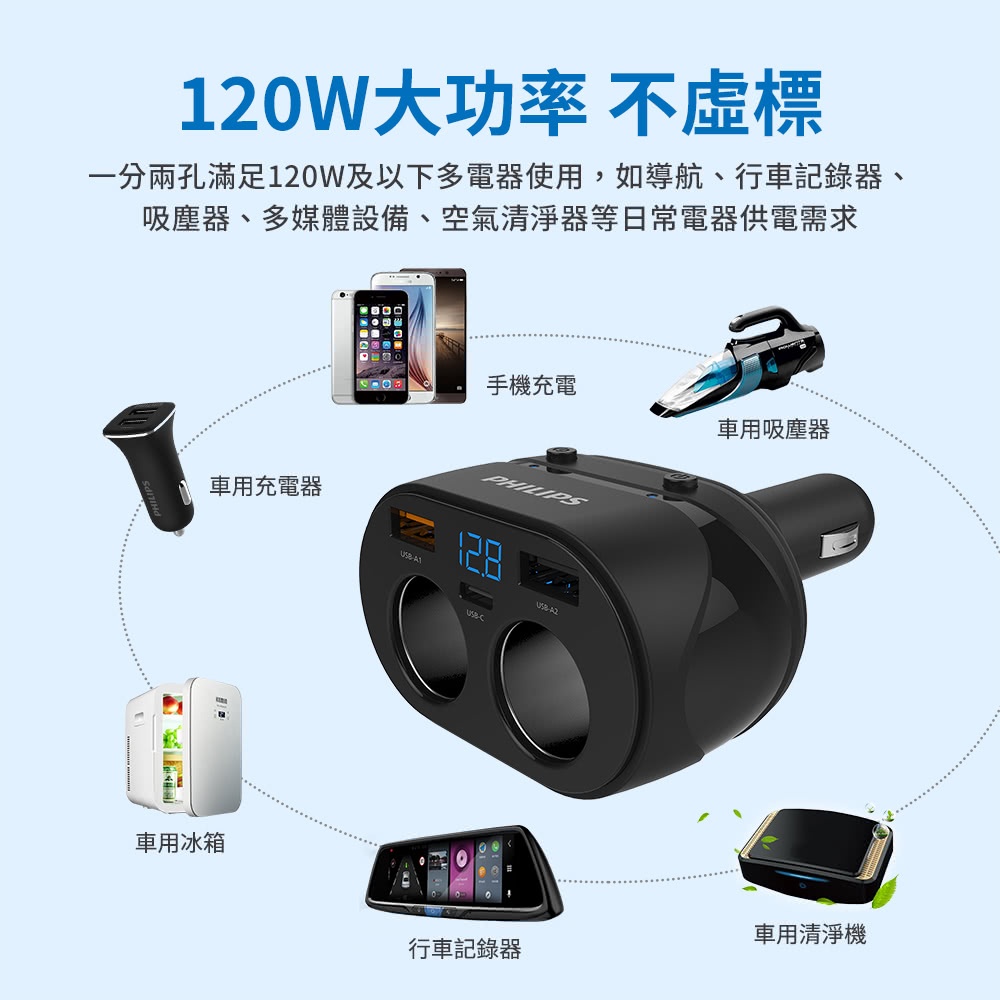 【免運】PHILIPS 飛利浦 車用充電器 PD20W 電壓顯示 一轉二車充 點菸器擴充 2A1C DLP3521NC