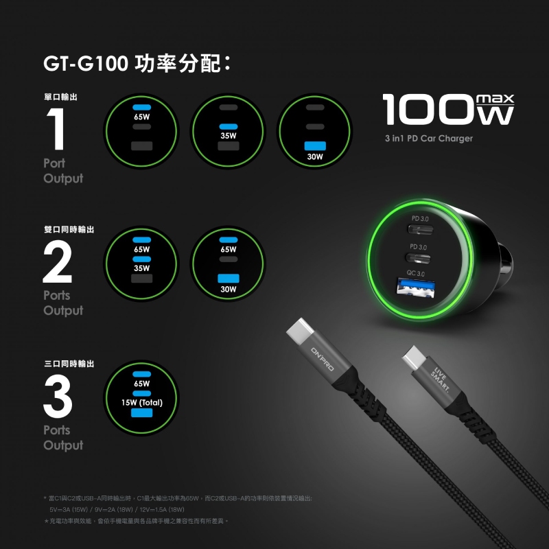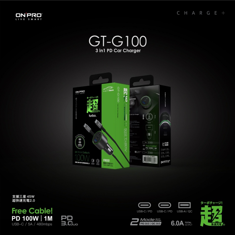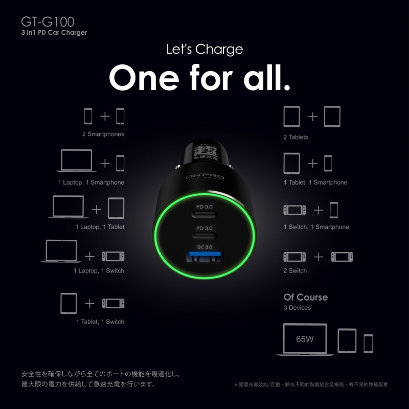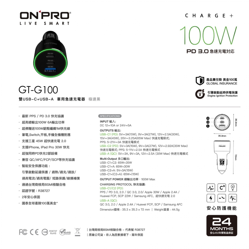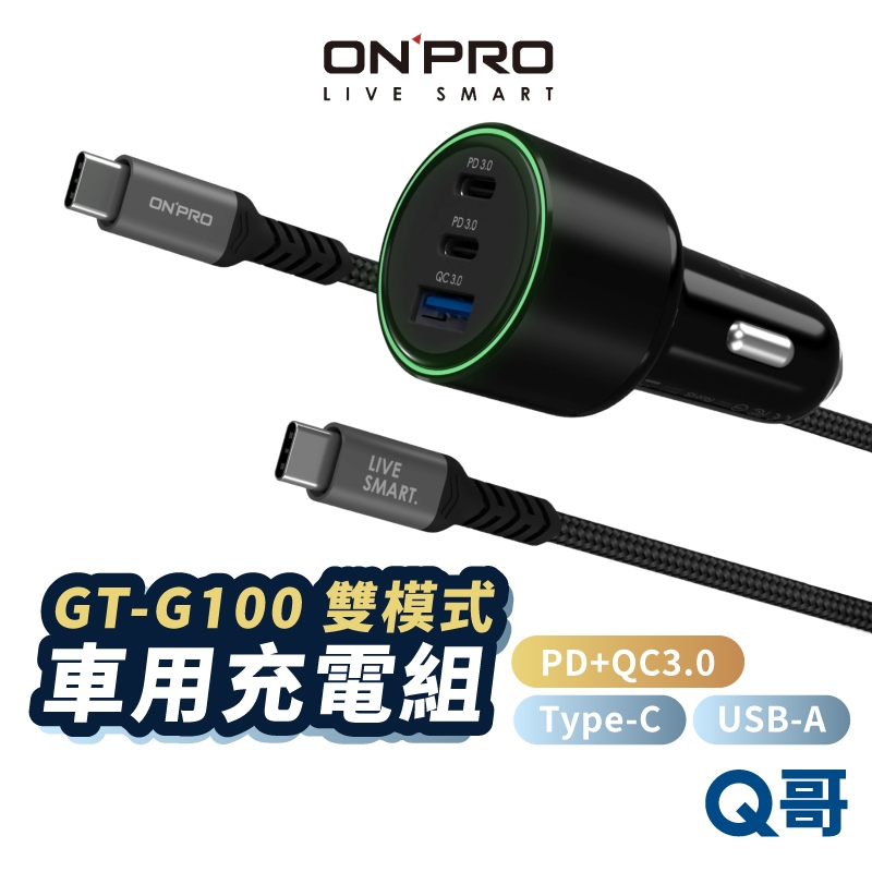 ONPRO GT-G100 雙模式快充PD+QC3.0 100W 急速車充 三孔 PD快充 車用充電器 點煙器 ON53PD+QC3.0 100W 急速車用充電USB Chargers, FM & Bluetooth TransmittersQ哥 旗艦商城|最專業的保護貼手機配件