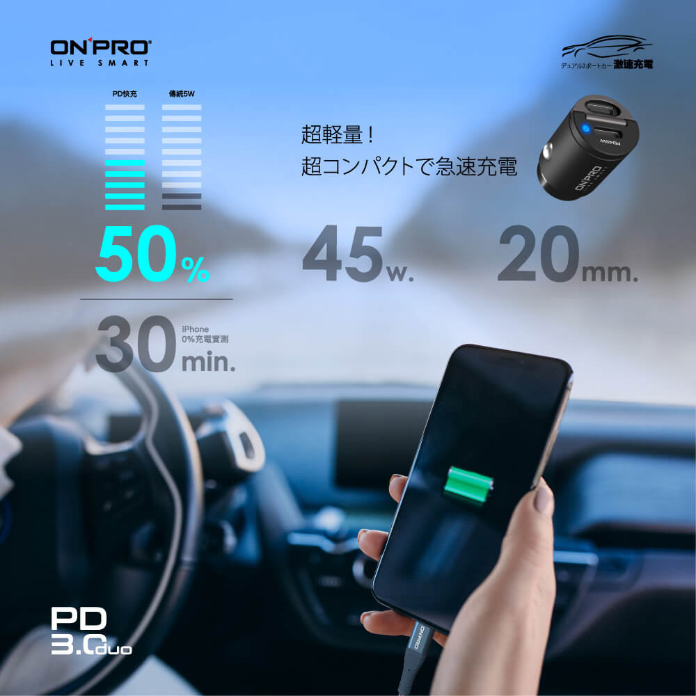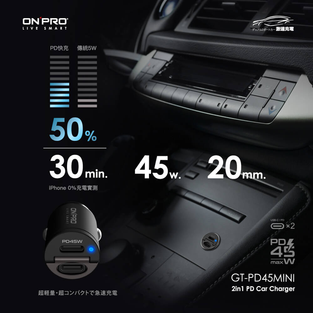 ONPRO GT-PD45MINI 45W 隱藏式雙Type-C車用PD快充充電器