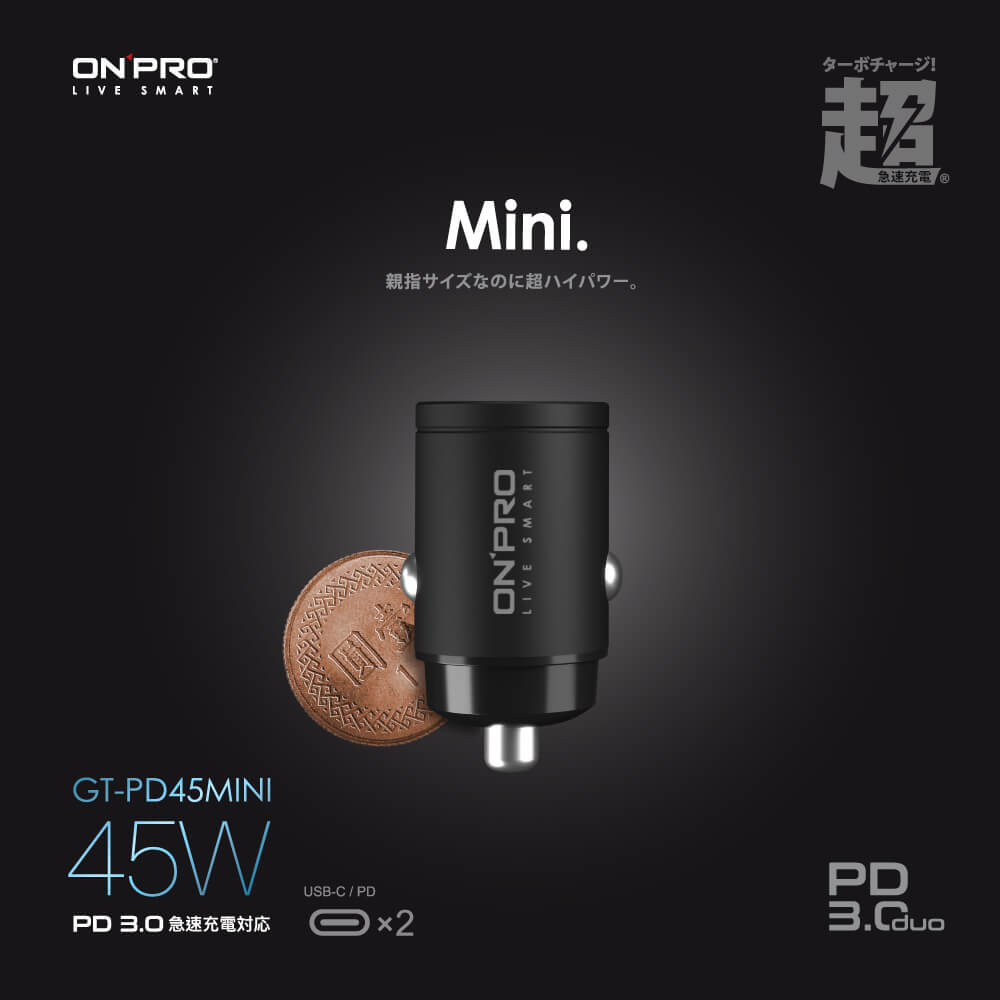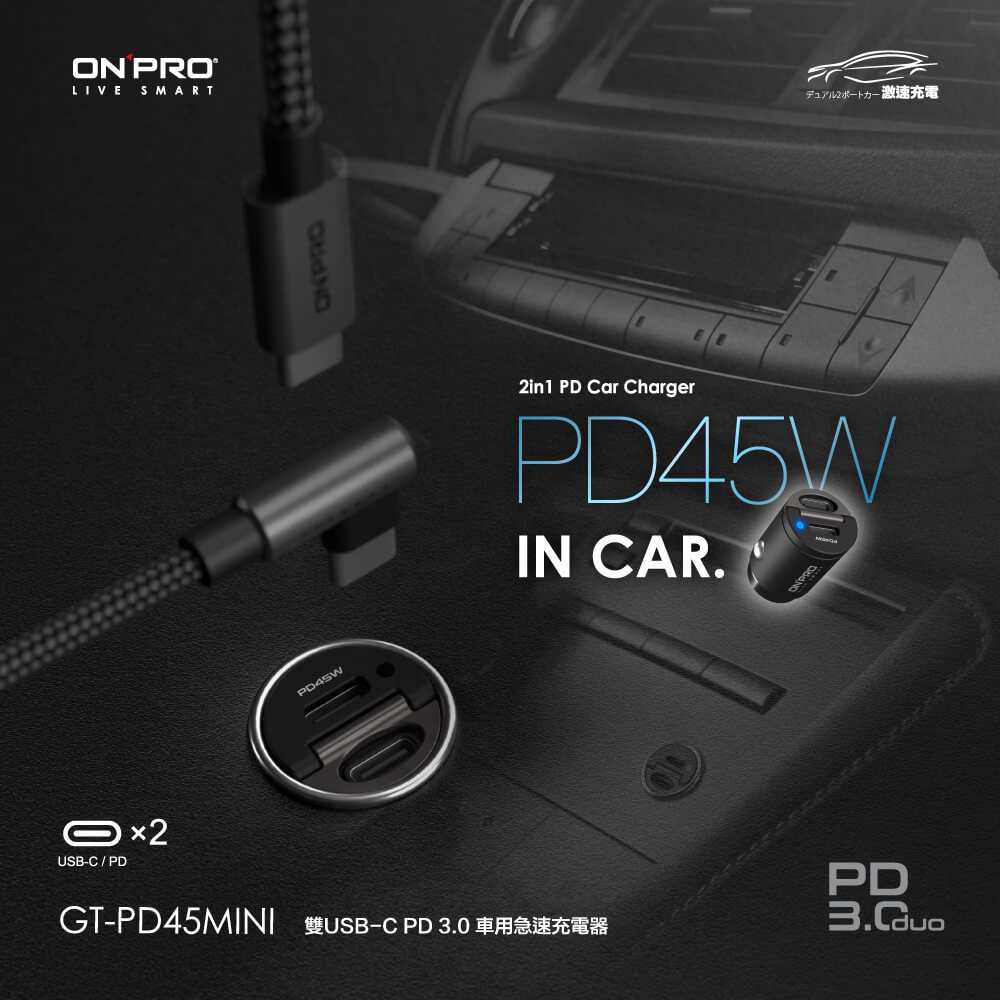 ONPRO GT-PD45MINI 45W 隱藏式雙Type-C車用PD快充充電器極速黑USB Chargers, FM & Bluetooth TransmittersONPRO超急速充電 官方旗艦館