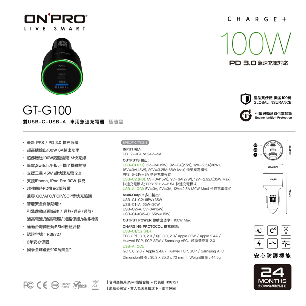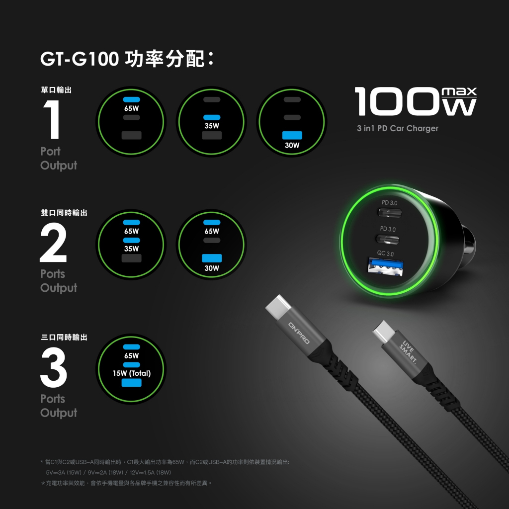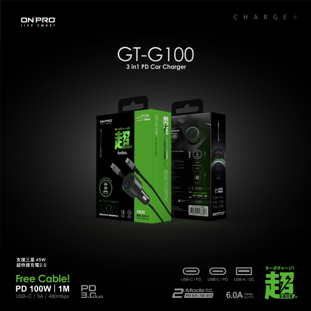 ONPRO GT-G100 100W 雙模快充3.0 PD+QC 3孔 車用快充充電器+附贈100W快充線ONPRO GT-G100 100W 雙模快充3.0 PD+QC 3孔 車用快充充電器+附贈100W快充線USB Chargers, FM & Bluetooth TransmittersONPRO超急速充電 官方旗艦館