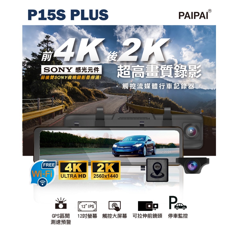 【PAIPAI 拍拍】12吋WIFI 雙SONY 前4K/後2K GPS聲控流媒體 P15S PLUS後照鏡行車記錄器P15SPLUS+64G行車卡|P15SPLUS+128G行車卡|P15SPLUSCamcorders & Parking CamerasPAIPAI行車紀錄器