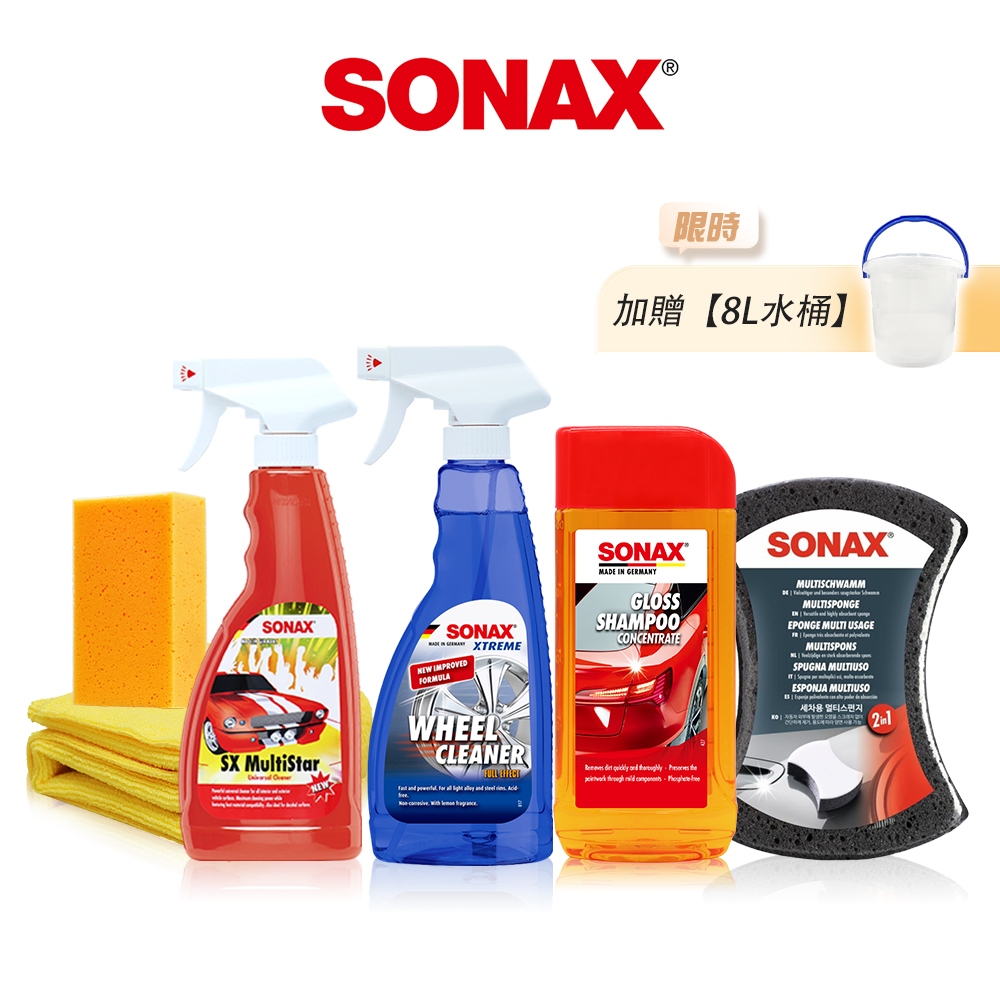 SONAX DIY洗車清潔組 送8L水桶 預洗必備 輪胎鐵粉 萬用 洗車精 海綿 鋼圈清潔 機車清潔 安全帽清潔DIY洗車清潔組|直播優惠下單區Tire & Wheel CareSONAX 歐洲第一汽車鍍膜 中性洗車藥劑 棕櫚蠟 洗車精 汽車美容 台灣總代理