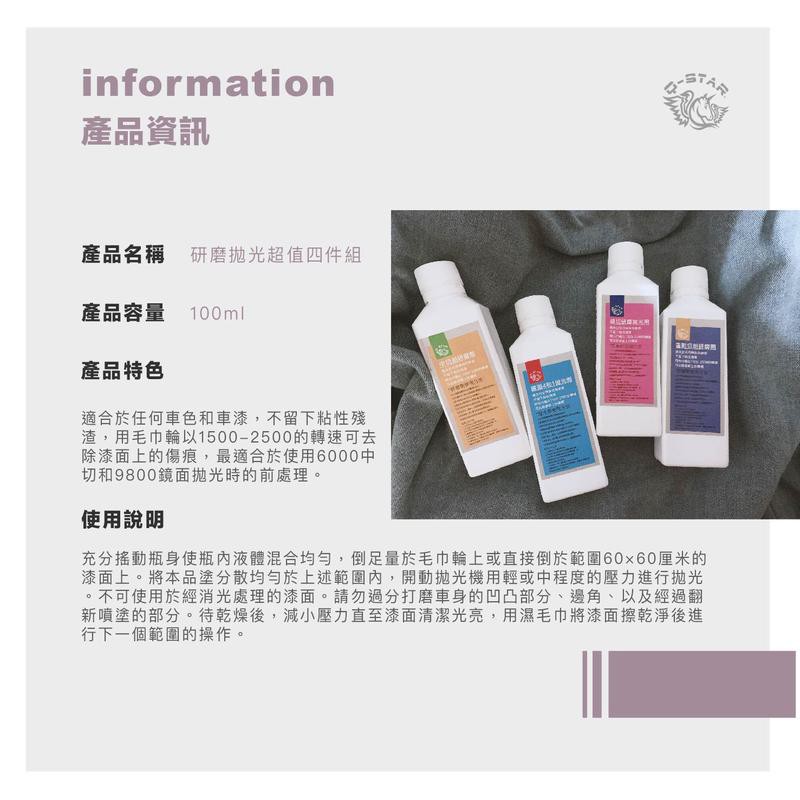 Q-STAR 研磨系列 9號重切削+中切削研磨劑+細切削研磨劑+鏡面拋光劑 各100ml 汽車美容 研磨劑 拋光劑Q-STAR 研磨系列 9號重切削+中切削研磨劑+細切削研磨劑+鏡面拋光劑 各100ml 汽車美容 研磨劑 拋光劑OthersQ-STAR皇后之鑽有限公司 車蠟 棕梠蠟 汽車美容 洗車用品 鍍膜 洗車打蠟