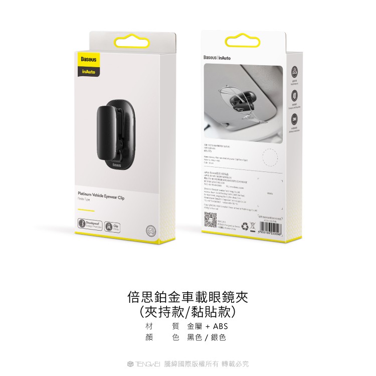 【Baseus倍思】鉑金車用眼鏡夾 /黏貼款/夾持款 /充電線收納停車卡收納車內收納車內掛眼鏡收納黑色/夾持款|銀色/夾持款|黑色/黏貼款|銀色/黏貼款Organizers & CompartmentsNawies 手機配件 | 代理 倍思 / Lisen / amuok