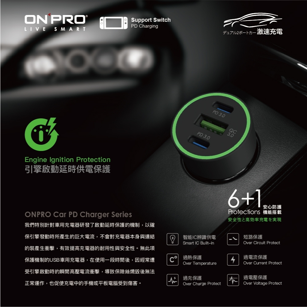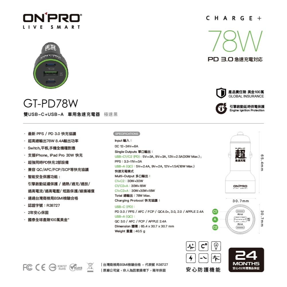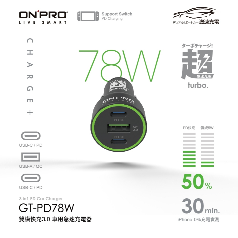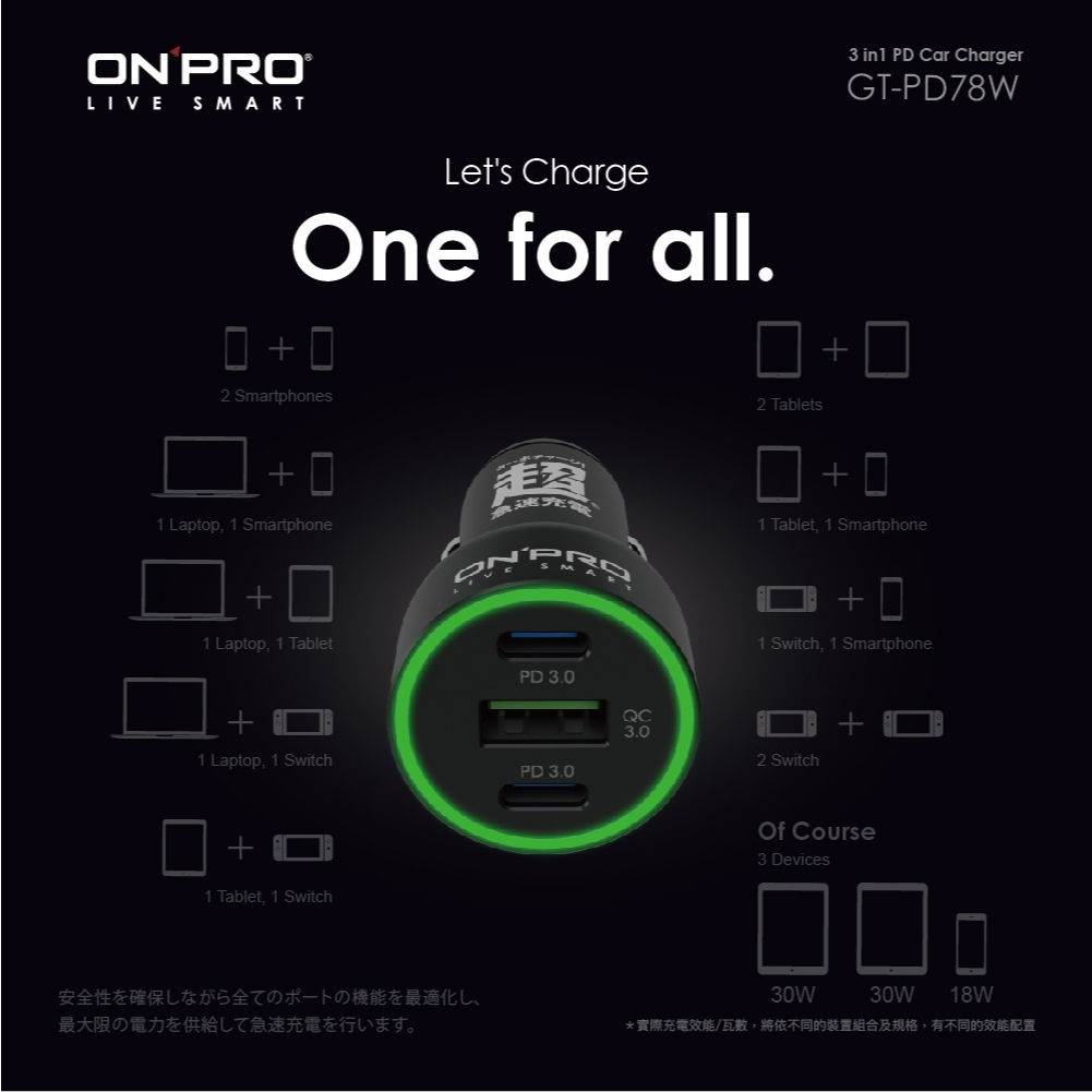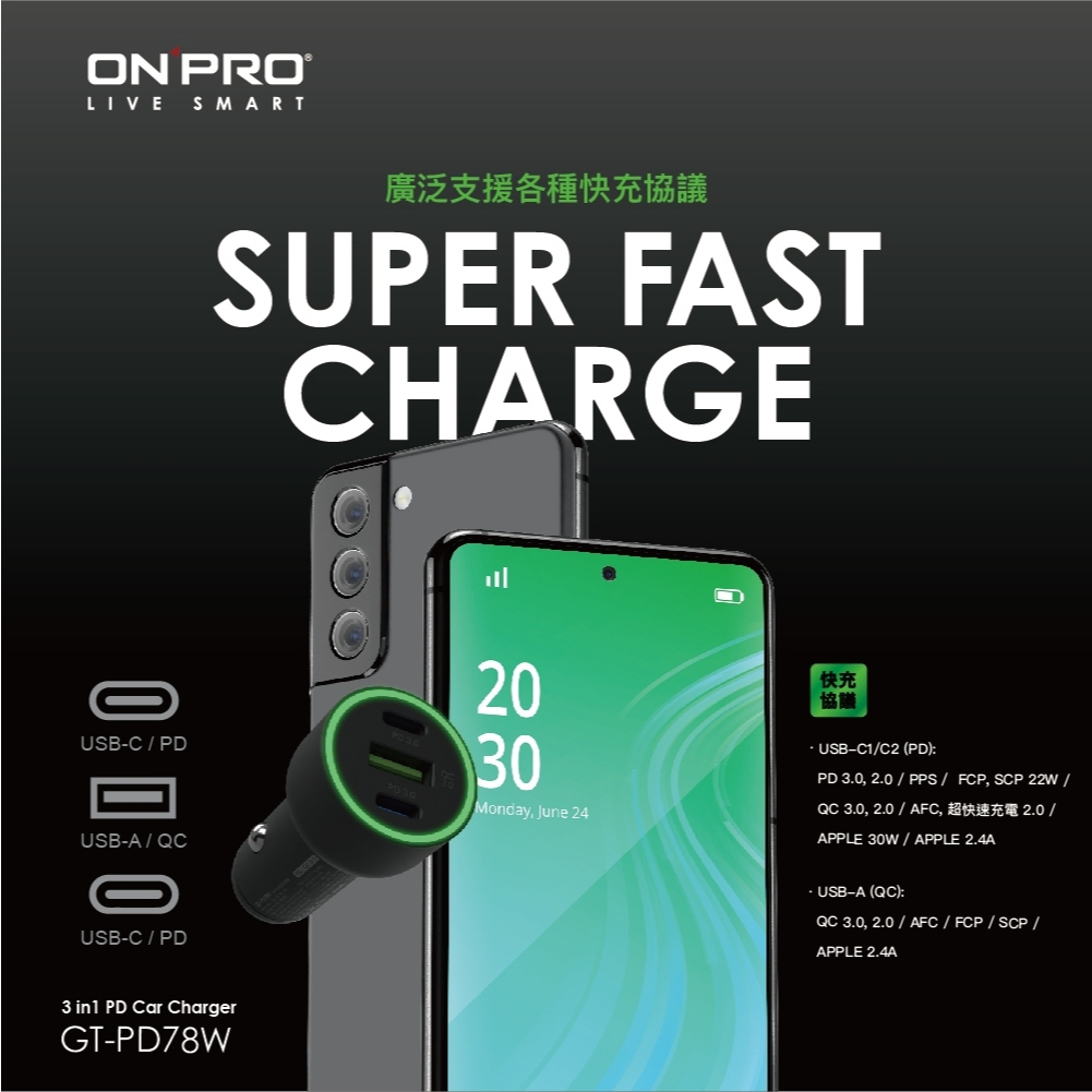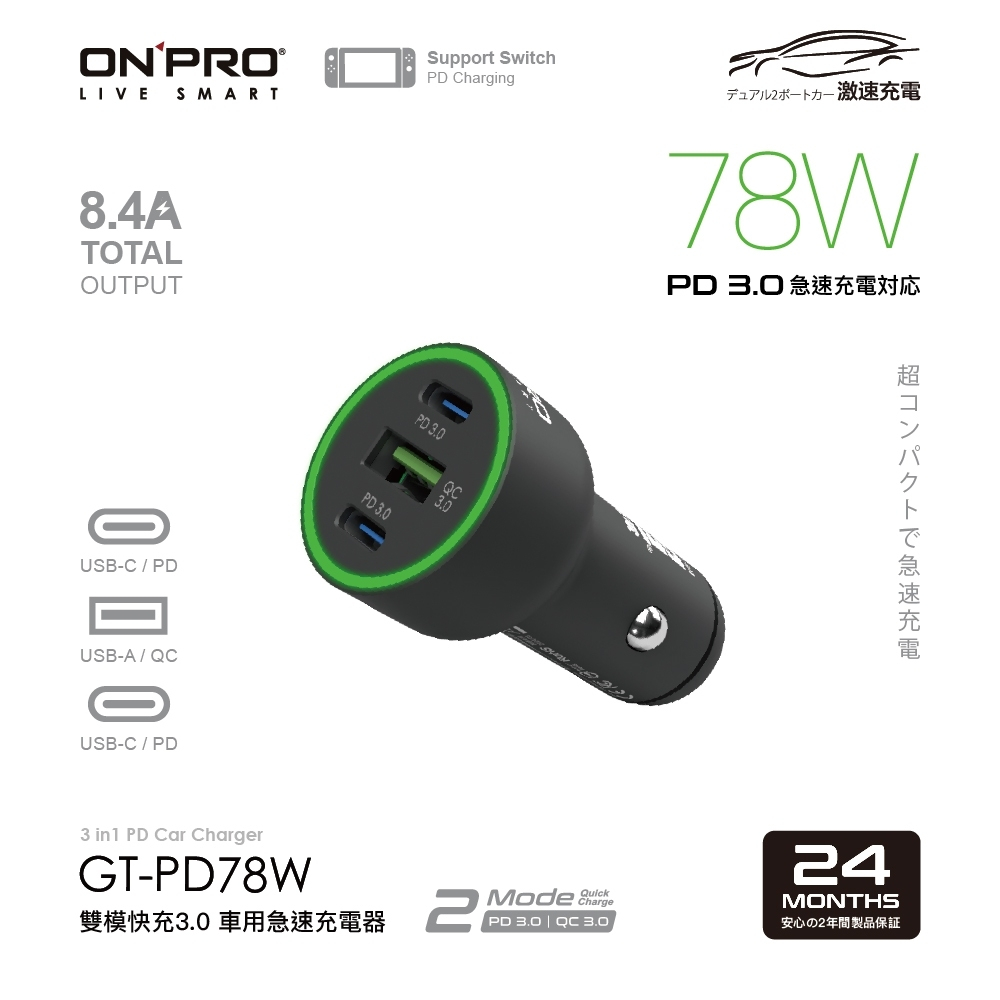 ONPRO GT-PD78W 78W 雙模快充3.0 PD+QC 3孔 車用快充充電器ONPRO GT-PD78W 78W 雙模快充3.0 PD+QC 3孔 車用快充充電器USB Chargers, FM & Bluetooth TransmittersONPRO超急速充電 官方旗艦館