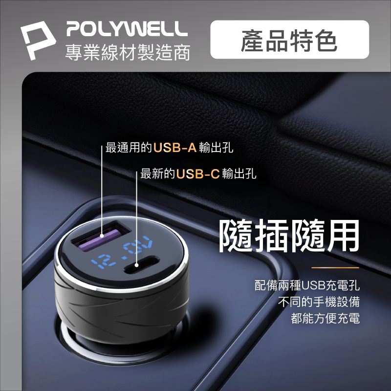 POLYWELL USB+Type-C 27W車用充電器 PD快充 電瓶電量顯示 BSMI認證 寶利威爾 台灣現貨USB+Type-C 雙孔車用充電器USB Chargers, FM & Bluetooth TransmittersPOLYWELL寶利威爾官方旗艦店