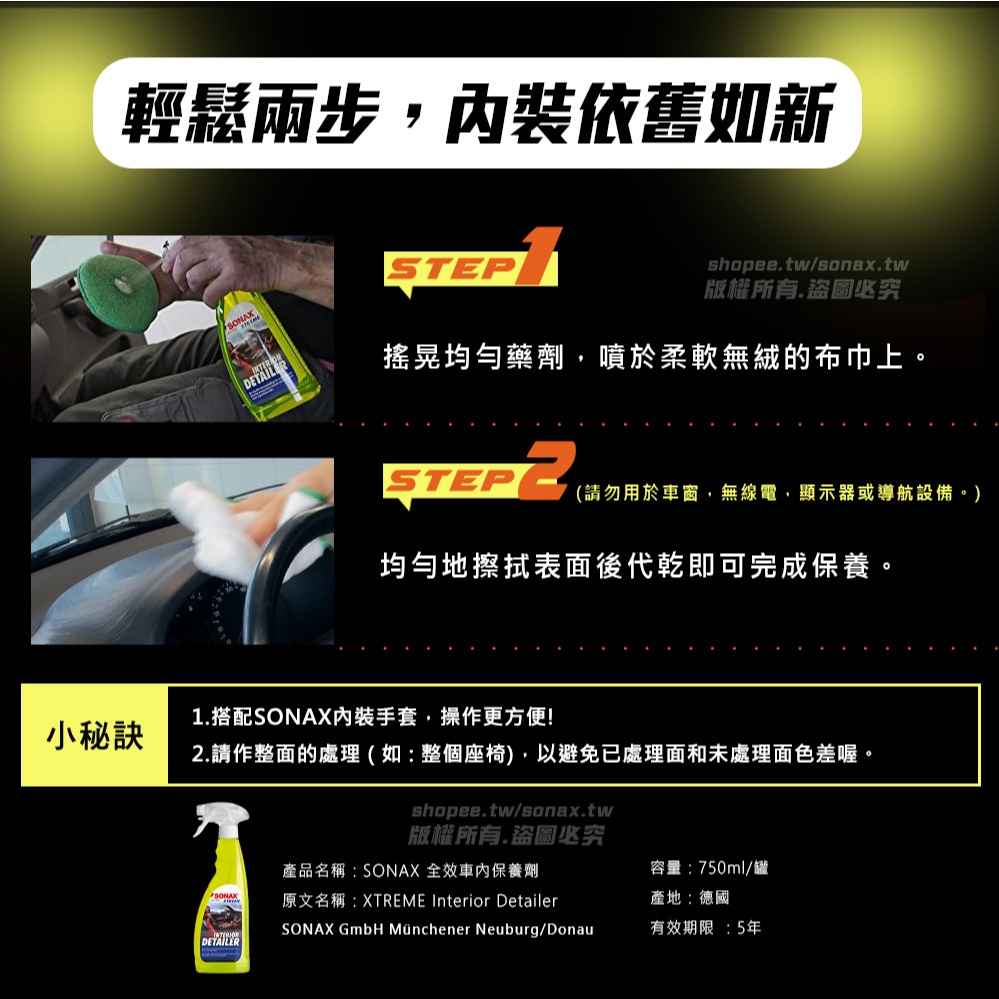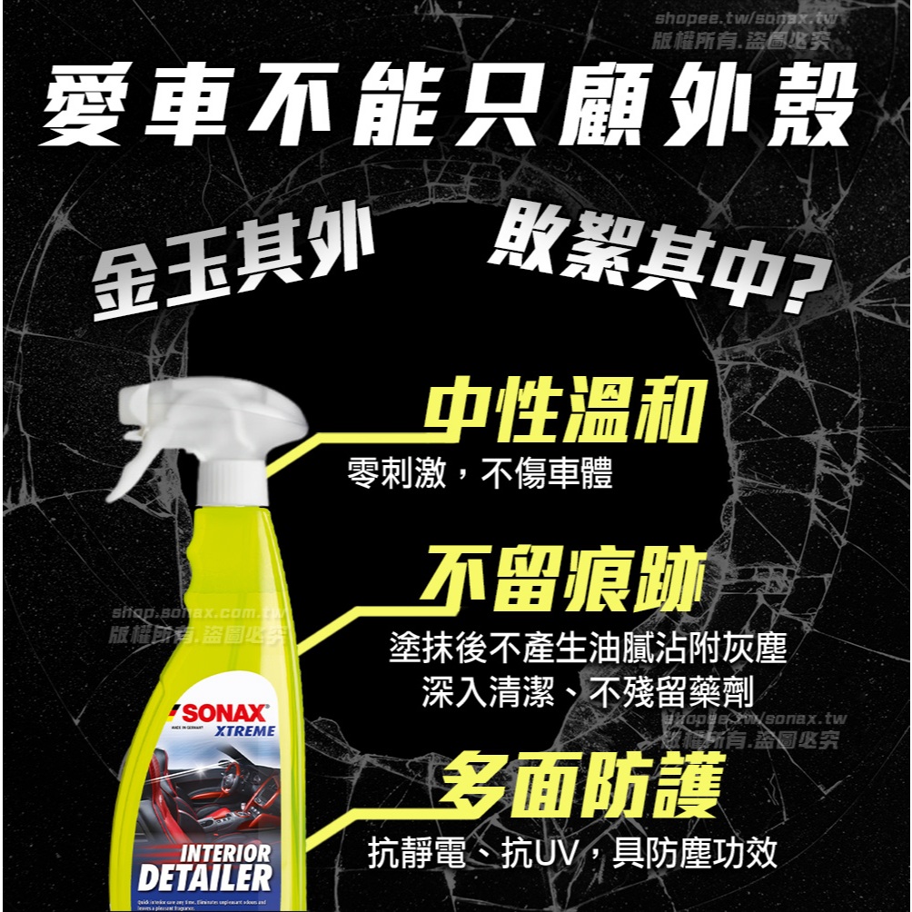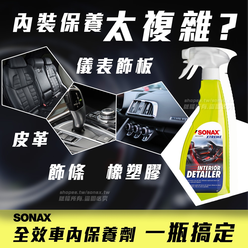 SONAX 全效車內保養劑 內裝清潔 保養 一瓶搞定 皮椅 塑膠 頂棚 異味去除 Interior Detailer單瓶 加贈 極柔纖維布|限時優惠|限時特賣|直播優惠下單區Interior CareSONAX 歐洲第一汽車鍍膜 中性洗車藥劑 棕櫚蠟 洗車精 汽車美容 台灣總代理