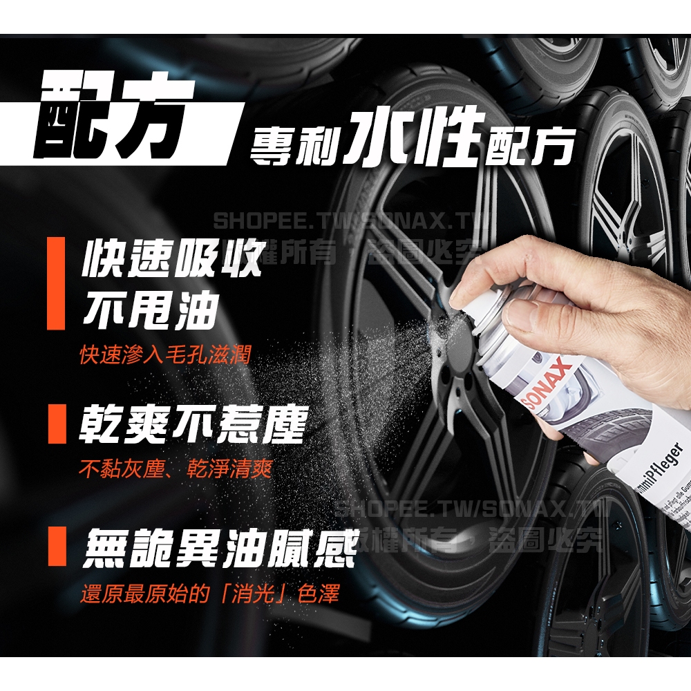 SONAX 輪胎鋼圈護膜 輪胎護膜 / 消光撥水 / 減緩輪胎氧化褪色 / 輪胎鋼圈護理單瓶 贈 極柔纖維布+握柄海綿|直播優惠下單區|限時特賣Tire & Wheel CareSONAX 歐洲第一汽車鍍膜 中性洗車藥劑 棕櫚蠟 洗車精 汽車美容 台灣總代理