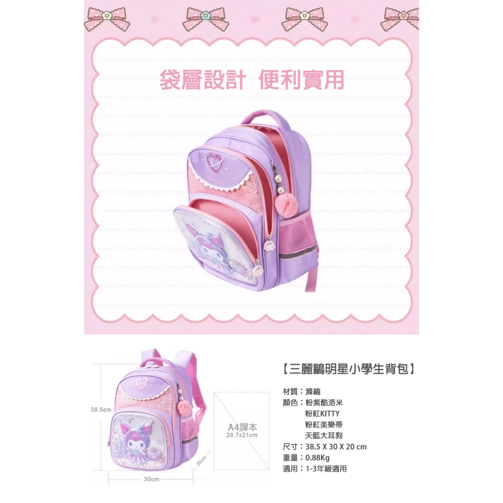 【STAR BABY】三麗鷗明星 酷洛米 金蔥亮片流沙 護脊 防潑水 大容量 小學生書包 1-4年級適用粉色KITTY|粉色美樂蒂|紫色酷洛米|天藍大耳狗Bags & LuggageSTAR BABY 官方直營店
