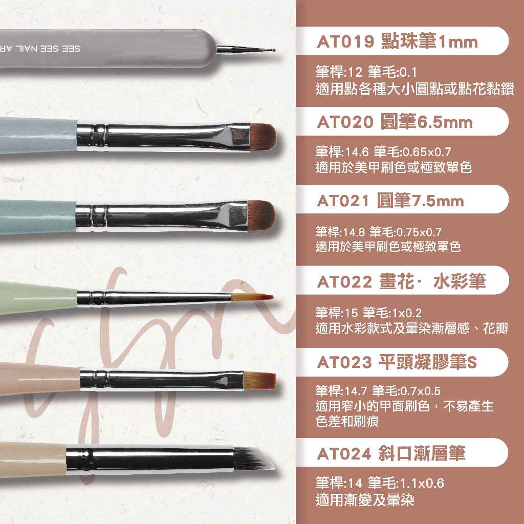 【SEE SEE NAIL】美甲彩繪筆 AT019-AT024 單支 刷具 圓筆 點珠筆 水彩筆 斜筆 斜口漸層筆 平頭AT024-斜口漸層筆|AT019-1mm點珠筆|AT020-6.5mm圓筆|AT021-7.5mm圓筆|AT022-畫花·水彩筆|AT023-平頭凝膠筆SNail CareSEE SEE NAIL 美甲彩繪筆的專家