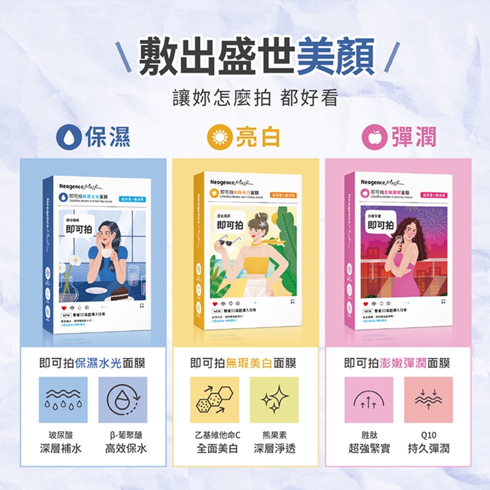 霓淨思 超爆水 潤澤保濕/透亮煥白/清爽保濕 面膜3盒組(15片) 官方旗艦店潤澤保濕5片/盒*3盒(共15片)|透亮煥白5片/盒*3盒(共15片)|清爽保濕5片/盒*3盒(共15片)|綜合3盒 潤澤+煥白+保濕(共15片)Face Mask & PacksNeogence霓淨思官方旗艦店