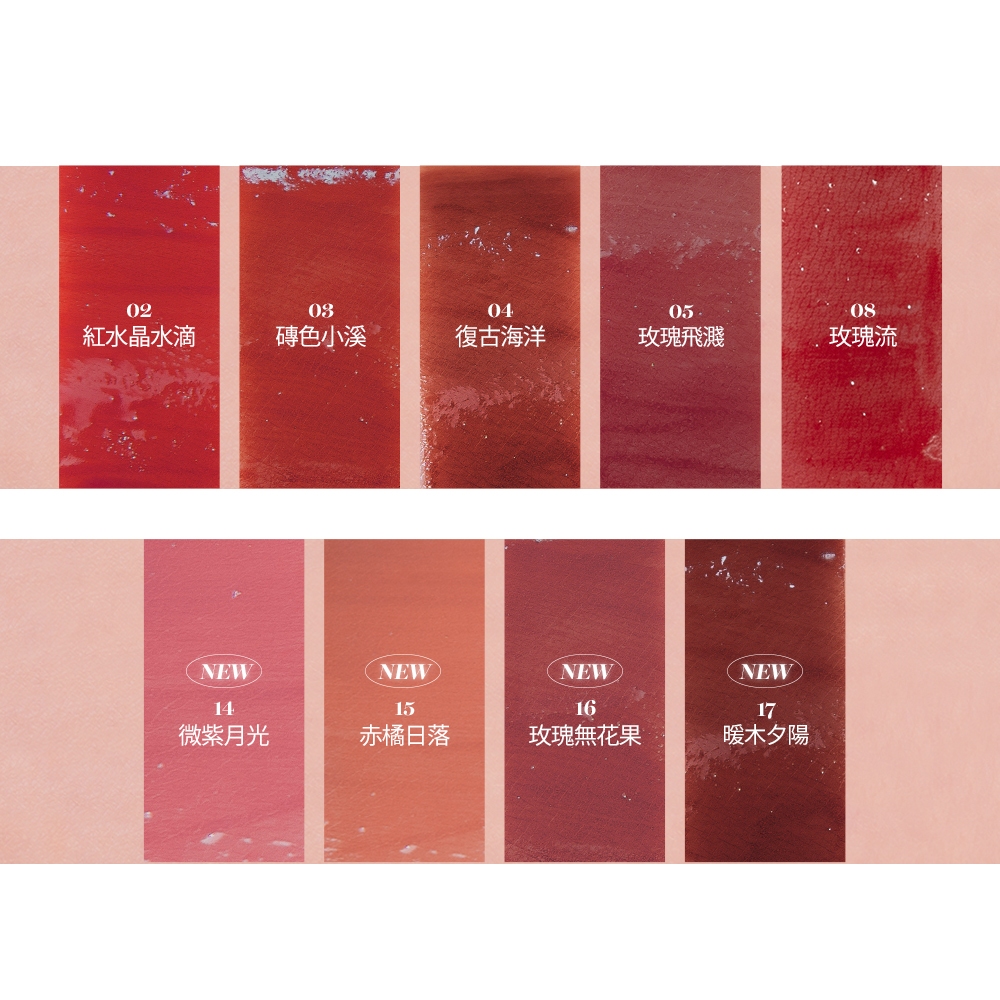 rom&nd 玻璃光持久水光唇釉 4g05 玫瑰飛濺ROSE SPLASH|(停產)06 紫色淋浴PURPLE SH|(停產)07 粉红谷PINK VALLE|08 玫瑰流ROSE STREAM|(停產)01 珊瑚霧CORAL MIST|02 紅水晶水滴RED DROP|03 磚色小溪BRICK RIVER|04 復古海洋VINTAGEOCEAN|14 微紫月光 Mauve Moon|15 赤橘日落 Nudy Sundown|16 玫瑰無花果 Figrise|17 暖木夕陽 Woody SunsetLipsrom&nd|nuse 官方旗艦店