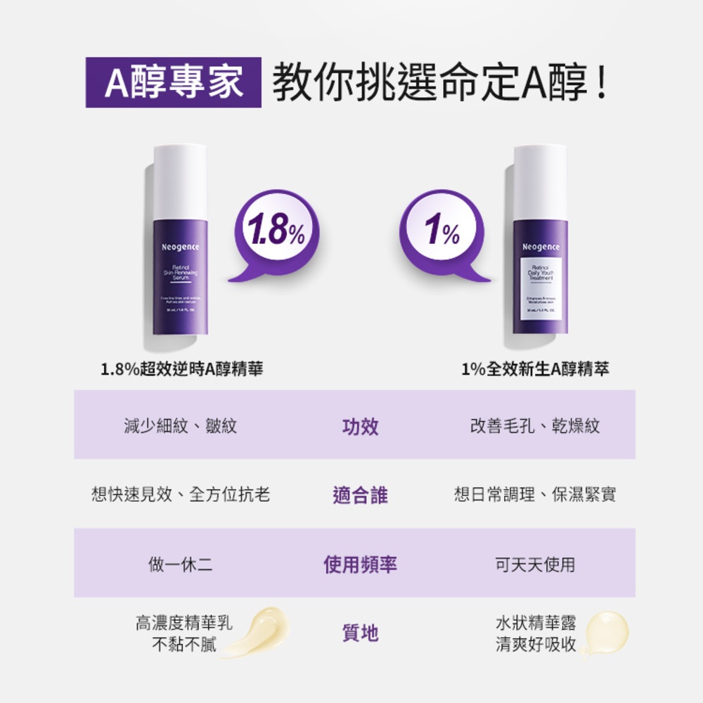 霓淨思 逆時新生A醇全效雙星組(1%新生A醇精萃30ml+1.8%逆時A醇精華30ml) 官方旗艦店1%A醇精萃+1.8%A醇精華Facial Serum & EssenceNeogence霓淨思官方旗艦店