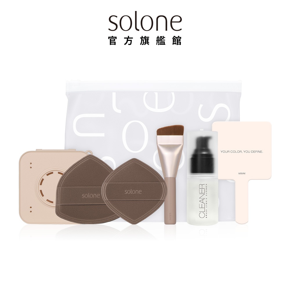 Solone 特調摩卡上妝工具組 (舒芙蕾海綿+收納盒+粉底刷+手拿鏡+水洗清潔液)【官方旗艦館】特調摩卡上妝工具組1入Solone 官方旗艦館