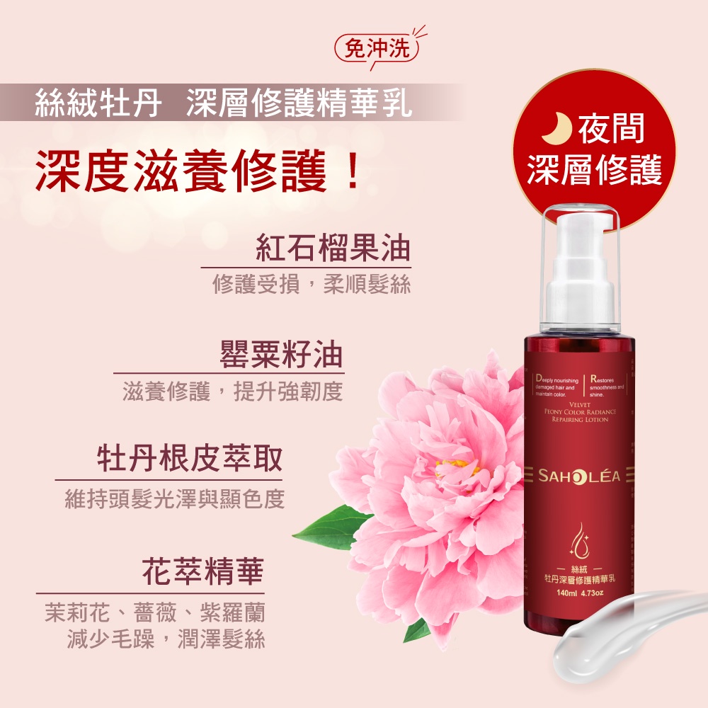 【SAHOLEA森歐黎漾】絲絨牡丹深層修護精華乳140ml(免沖洗)修護精華乳140mlHair TreatmentSAHOLEA森歐黎漾 官方旗艦館