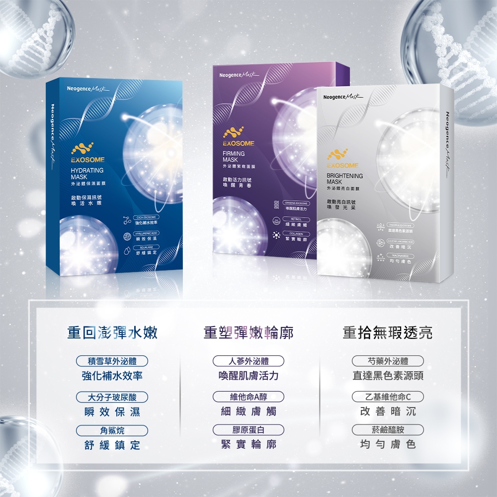 霓淨思 外泌體保濕/亮白/緊緻面膜《買1送1》 官方旗艦店外泌體保濕面膜*2盒(共8片)|外泌體亮白面膜*2盒(共8片)|外泌體緊緻面膜*2盒(共8片)Face Mask & PacksNeogence霓淨思官方旗艦店