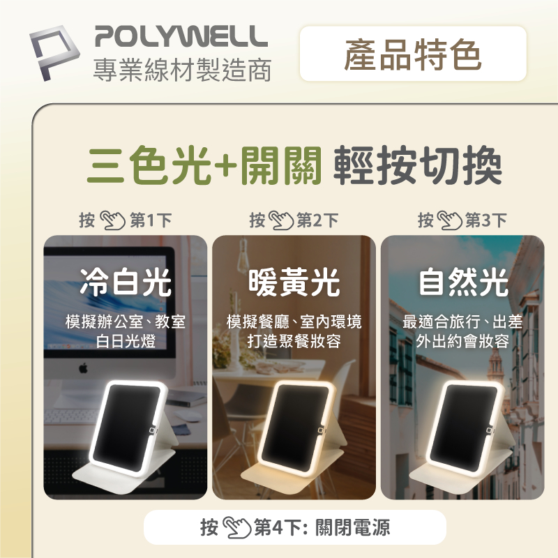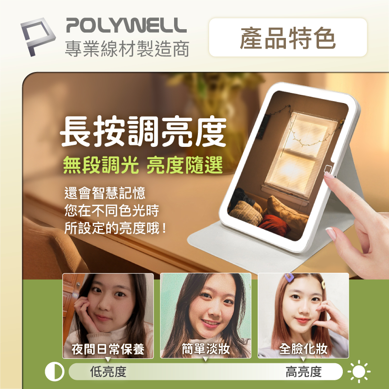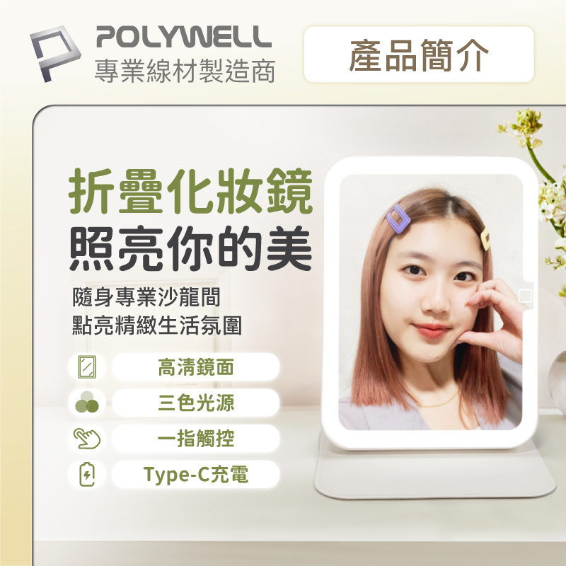 POLYWELL 攜帶式LED折疊化妝鏡 美妝鏡 梳妝鏡 化妝補光帶燈桌鏡 三段色溫 無段調光 寶利威爾 台灣現貨低調黑|奶油白|粉嫩綠Makeup AccessoriesPOLYWELL寶利威爾官方旗艦店