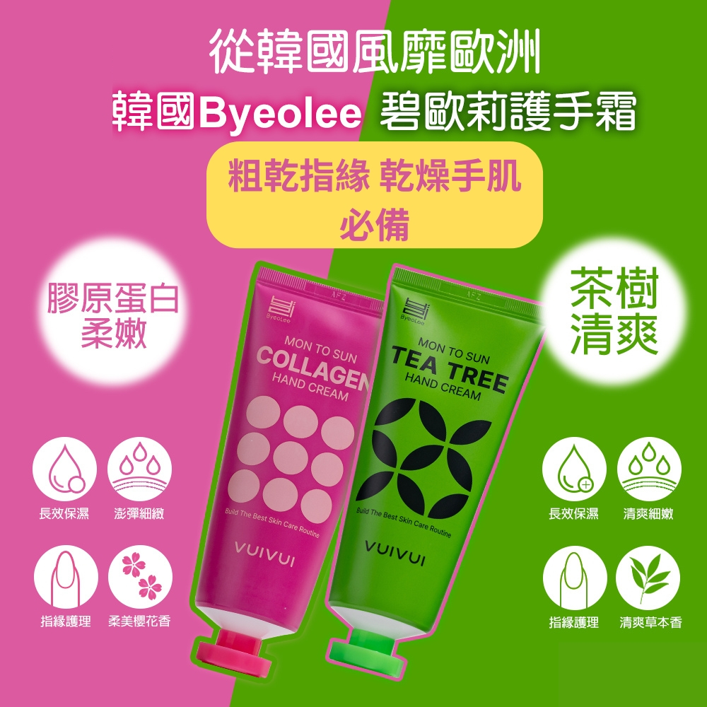 Byeolee 碧歐莉 韓國 護手霜100g- 膠原蛋白柔嫩/茶樹清爽茶樹清爽/凹盒(3入)|膠原蛋白/3入|膠原蛋白/凹盒(3入)|茶樹清爽/3入|膠原蛋白*2入+茶樹清爽*1入|膠原蛋白*1入+茶樹清爽*2入Hand CareMRJ Life慧緻生活 │官方旗艦店