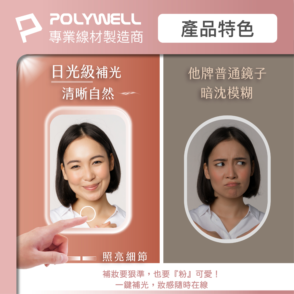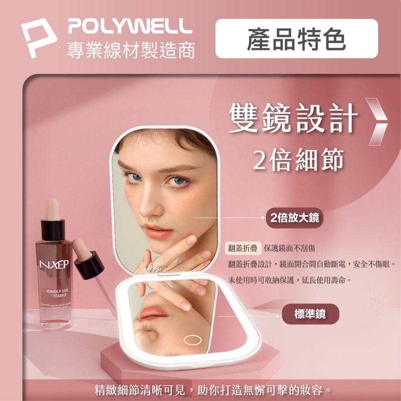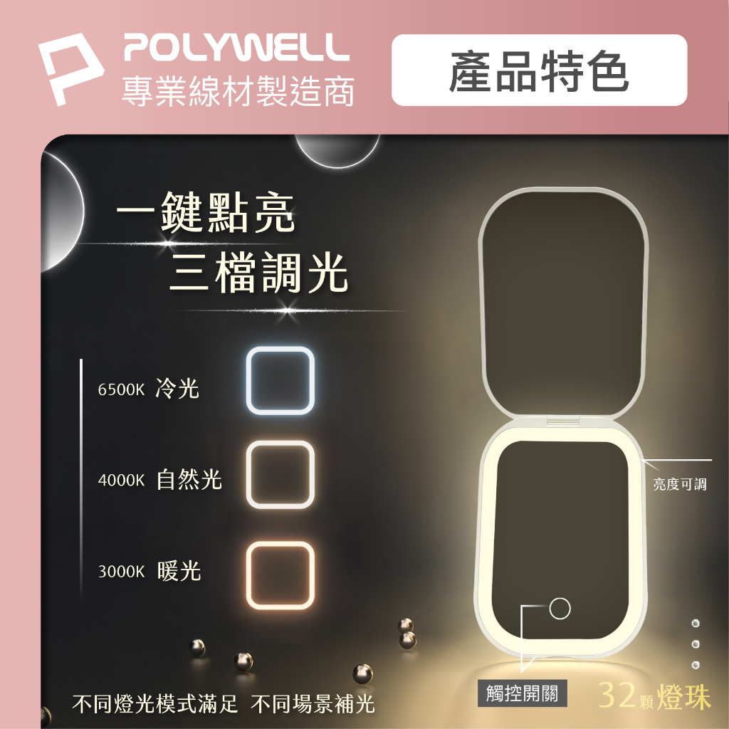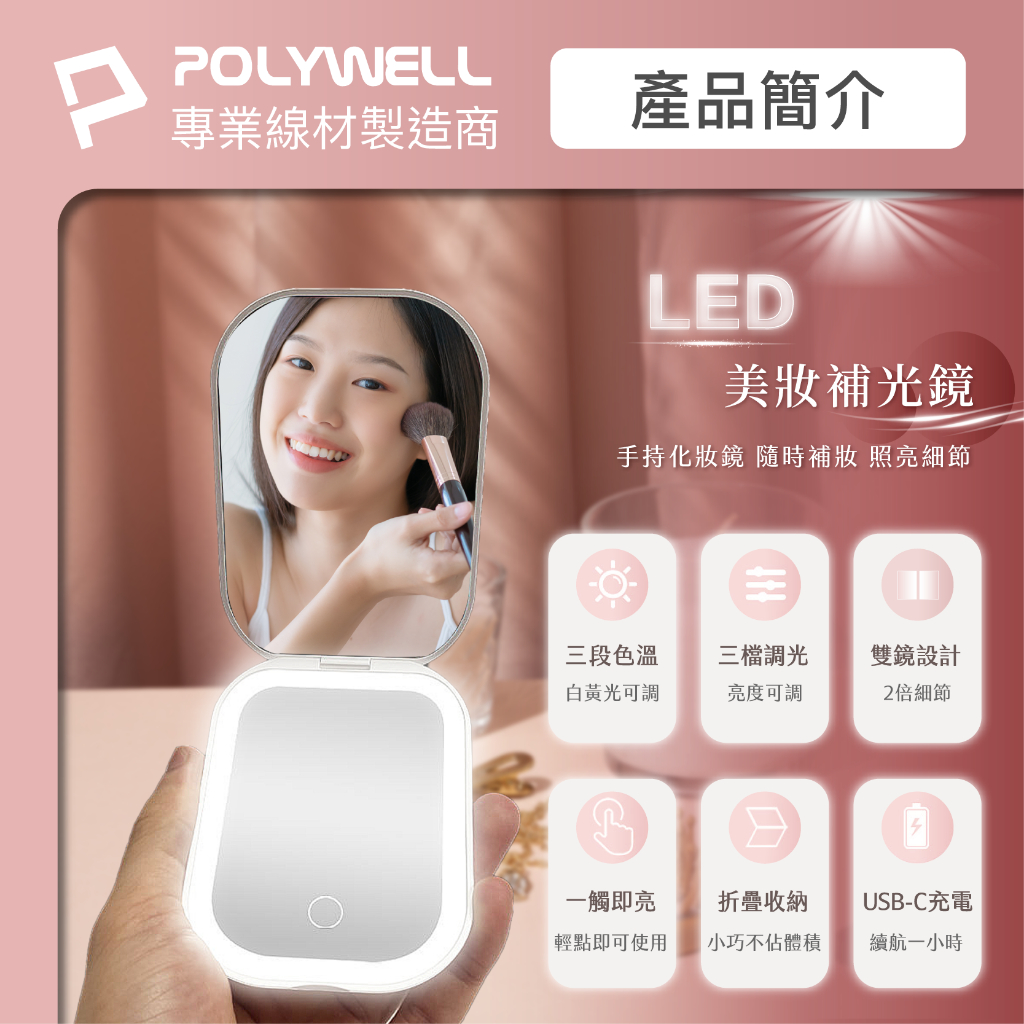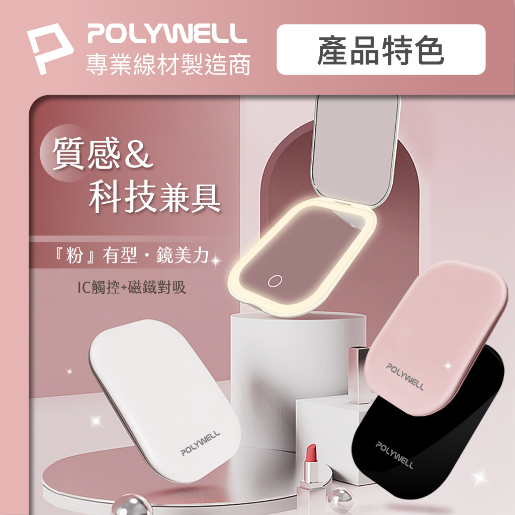 POLYWELL LED隨身化妝鏡 三段色溫 無段亮度可調 USB充電 美妝鏡 梳妝鏡 化妝補光 寶利威爾 台灣現貨黑色|白色|粉色Makeup AccessoriesPOLYWELL寶利威爾官方旗艦店
