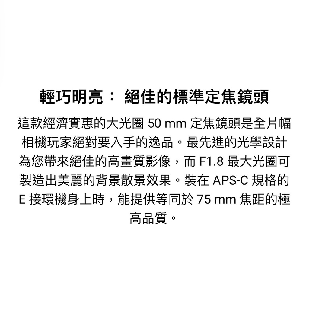 【SONY 索尼】SEL50F18F FE 50mm F1.8 全片幅 定焦鏡頭 (公司貨)【SONY 索尼】SEL50F18F FE 50mm F1.8 全片幅 定焦鏡頭 (公司貨)Sony相機官方授權經銷商-富士通