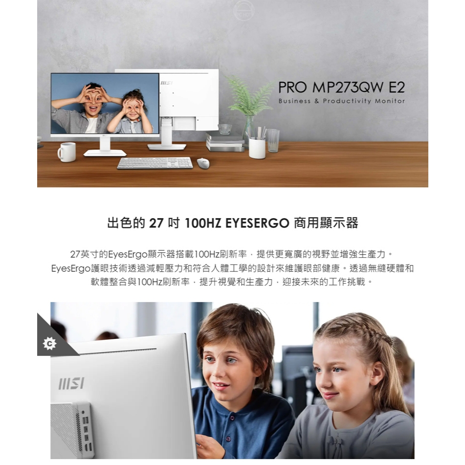 MSI 微星 PRO MP273QW E2 電腦螢幕 27吋 IPS 100Hz 1ms WQHD 商用螢幕 液晶螢幕主商品|⏰限時促銷PCHOT 線上電競 | 3C旗艦店
