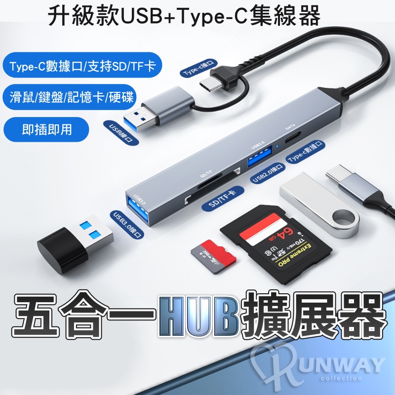 五合一 HUB USB3.0 Type-C 雙接口 擴展器 高速 集線器 SD TF卡 讀卡器 電腦 平板 手機USB/Type-C五合一擴展器,灰USB Hubs & Card ReadersRunway Collection