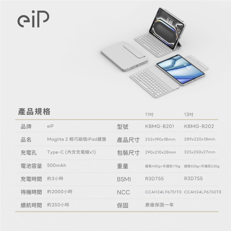 eiP Maglite 2 輕巧藍芽鍵盤 適用 iPad Pro Air 11 7 6 M3 M4 保護殼 EIP002Air 7 11吋【M3】|Air 6 11吋【M2】|Pro 11吋 1-4代|Air 4/5|Air 6 13吋【M2】|Air 7 13吋【M3】|Pro 12.9吋 3-6代|Pro 11吋【M4】|Pro 13吋【M4】KeyboardsQ哥 旗艦商城|最專業的保護貼手機配件