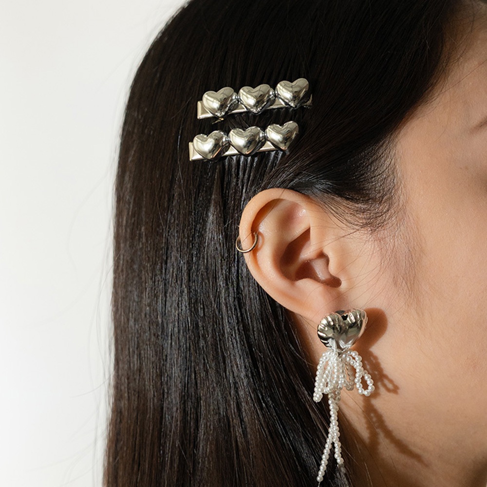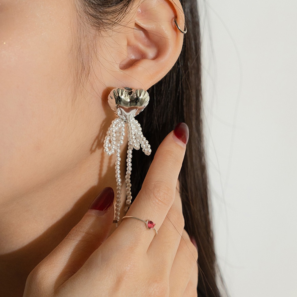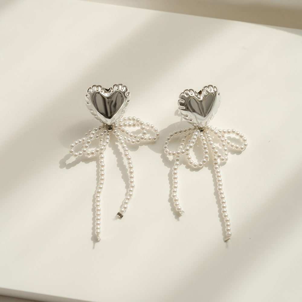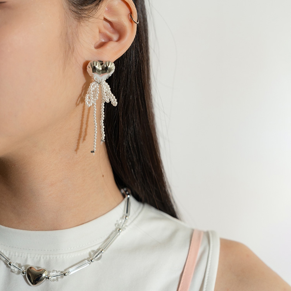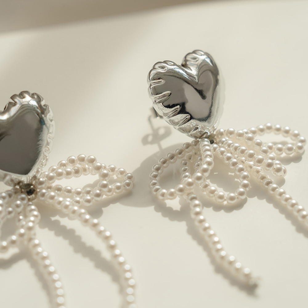 QUEENSHOP_ S 女裝 正韓 大愛心珍珠蝴蝶結垂墜耳針式耳環 現+預 【07030945】依賣場QUEENSHOP